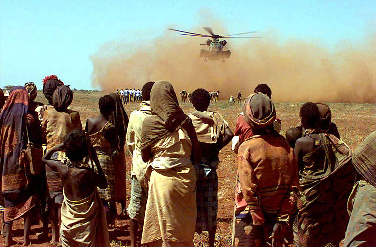 1992년 8월, 조지 H. W. 부시 미국 대통령은 Operation Provide Relief 작전을 통해 소말리아에 구호품을 공수하기 시작했다.[26] 10대의 C-130과 400명의 병력이 케냐 몸바사에 배치되어 6개월 동안 48,000톤의 식량과 의료 물품을 전달했다.[26]