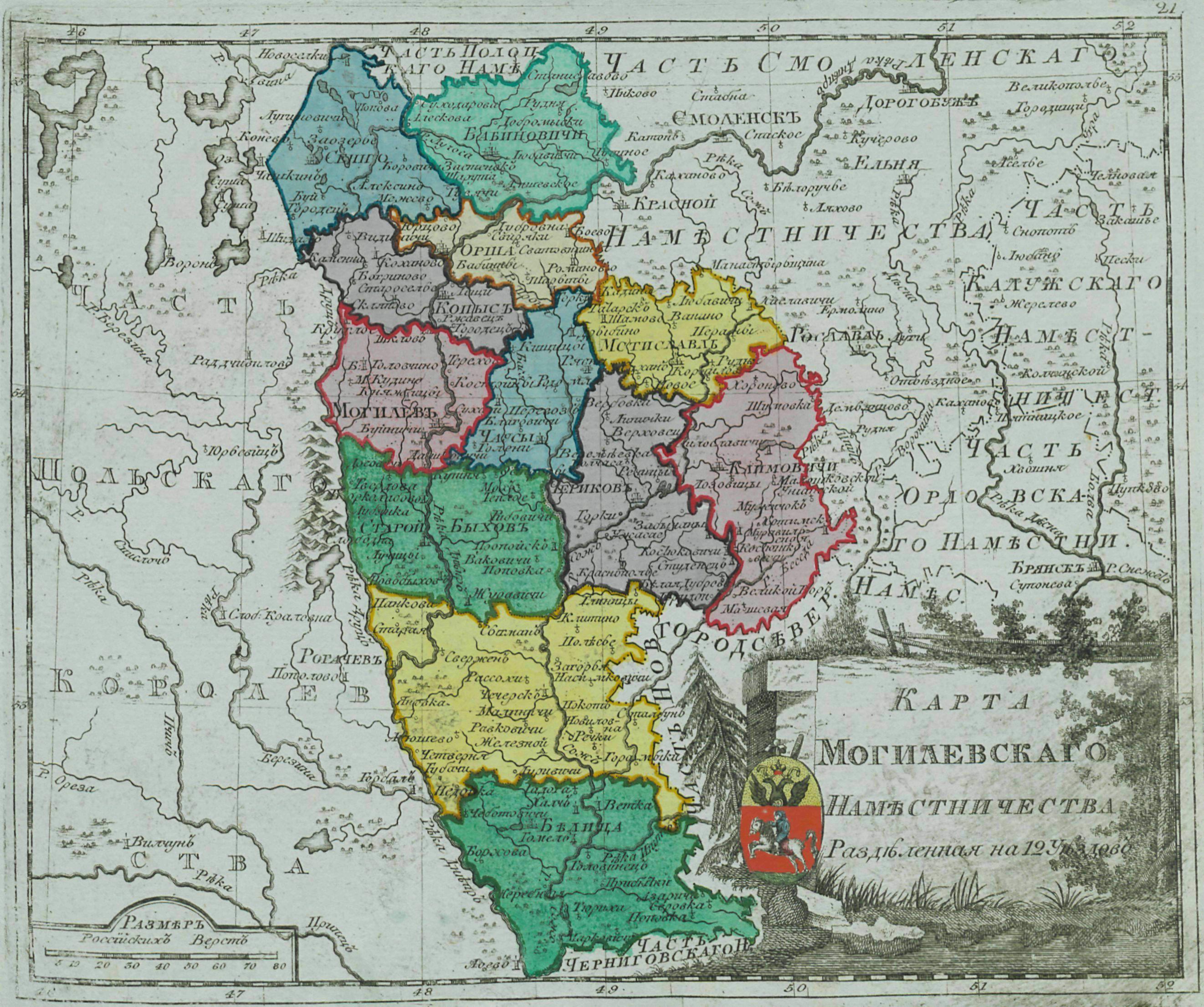 이 시기의 제정 러시아에서는 구베르니야(현)의 하위 구분으로 프로빈치야(군[4] 또는 지구[5])가 설치되었으며(1775년에 폐지), 설립 초기의 모길료프 현은 모길료프(ru), 므스티슬라블(ru), 오르샤(ru), 로가초프(ru)의 4 프로빈치야로 이루어져 있었다. 그 후의 행정 개혁에 의해, 모길료프 현 내의 하위 구분은 12개의 우예즈드(군[6][7])로 재편되었다.