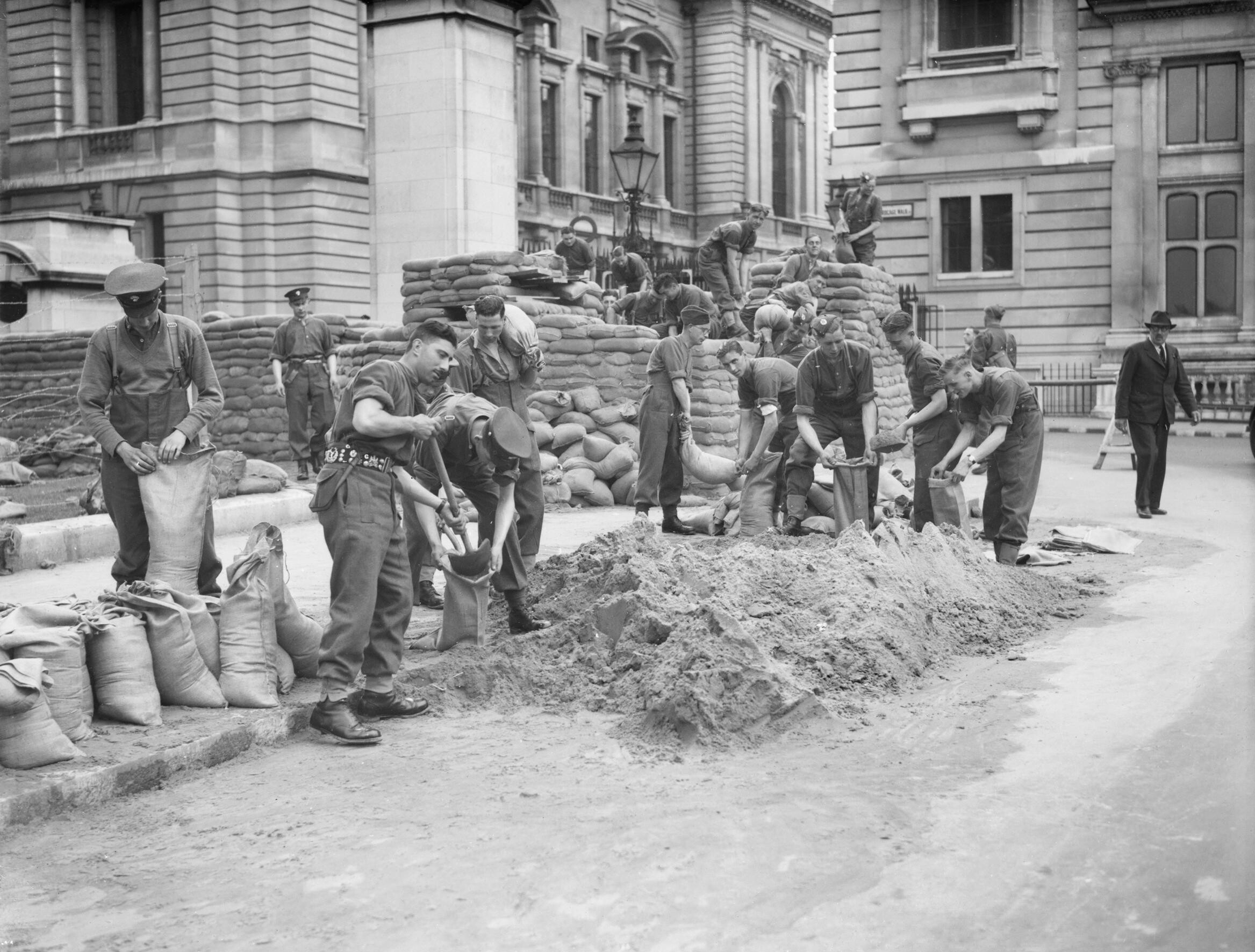 1940년 5월 런던 버드케이지 워크의 정부 건물 주변에 모래주머니 방어선을 구축하는 근위 보병 연대 병사들