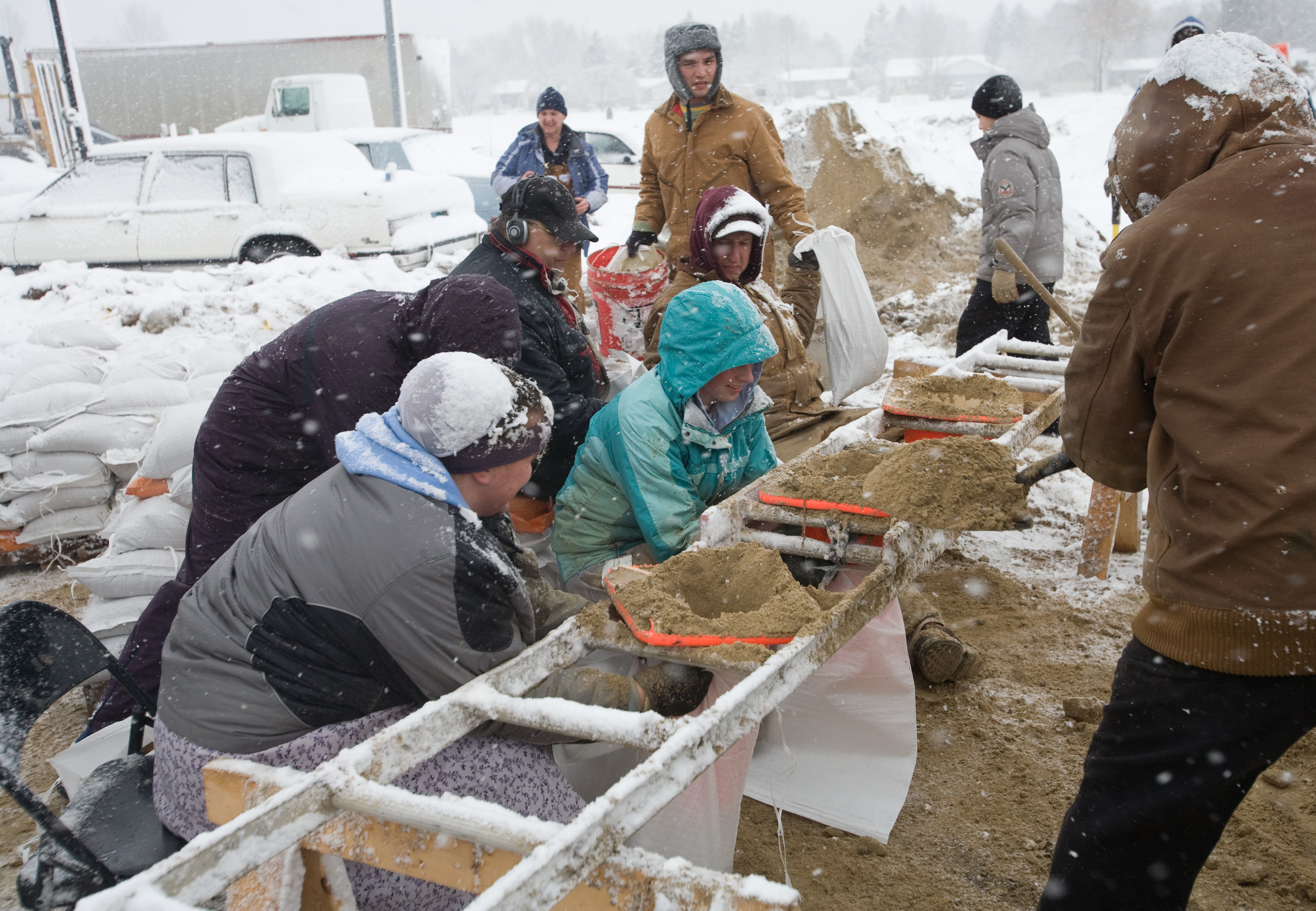 사다리를 사용하여 교통 콘을 깔때기로 활용해 모래 자루를 채우는 모습, 무어헤드, 2009년.