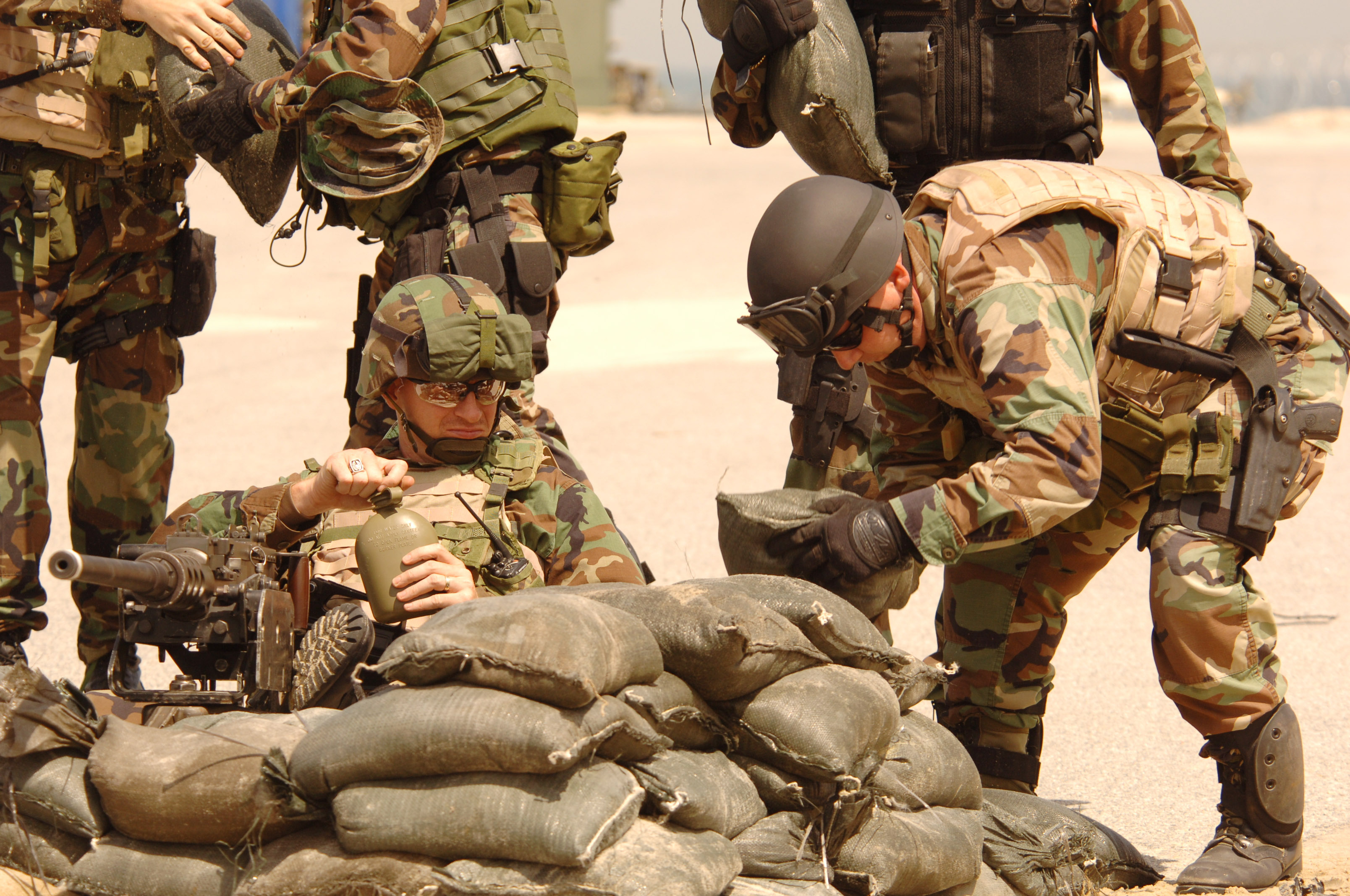 훈련에서 기관총 사수를 보호하기 위해 모래주머니를 쌓는 미국 해군 병사