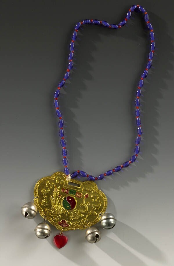 - 중국의 수명 자물쇠 목걸이: changmingsuo|長命鎖|수명 자물쇠중국어는 아이들을 악령과 불운으로부터 보호하기 위해 착용하는 부적으로, 금, 은, 옥과 같은 귀중한 재료로 만들어지며 길조를 기원하는 글자가 새겨져 있다.[17]
