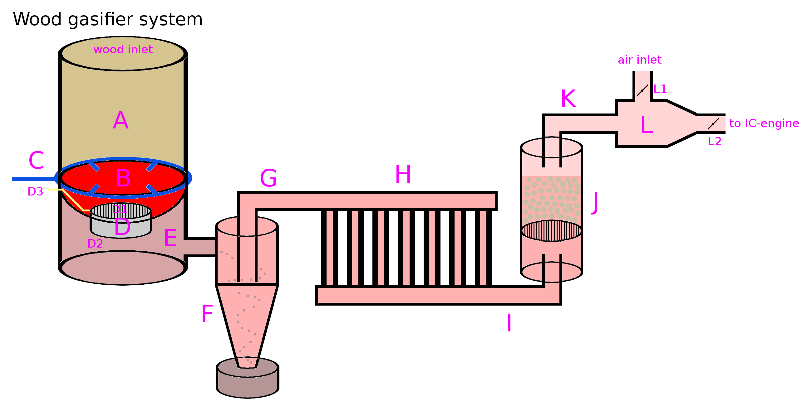 목탄 가스 발생기는 나무 조각, 톱밥, 숯, 석탄, 고무 또는 이와 유사한 재료를 연료로 사용하여 화실에서 불완전 연소를 시켜 목탄 가스, 고체 재, 그을음을 생성하며, 이 중 고체 재와 그을음은 가스 발생기에서 주기적으로 제거해야 한다.[6] 목탄 가스는 타르와 그을음/재 입자에 대해 여과 및 냉각 과정을 거친후 엔진이나 연료 전지로 보내진다.[6]
