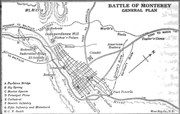 재커리 테일러 장군의 군대는 제임스 핀크니 헨더슨이 이끄는 텍사스 사단이 선두에 선 채 9월 19일 오전 9시에 몬테레이 앞 평원에 도착했고, 성채 꼭대기에 위치한 산 파트리시오 포대에 있는 호세 로페스 우라가 대령의 제4보병대 포병의 사격을 받았다.[1] 테일러는 공병대 (조셉 K. 맨스필드 소령)의 정찰을 위해 군대가 보스케 데 산 도밍고에 진을 치도록 명령했다.[1]성채 외에도 멕시코군의 주요 방어 거점은 다음과 같았다:[1]
