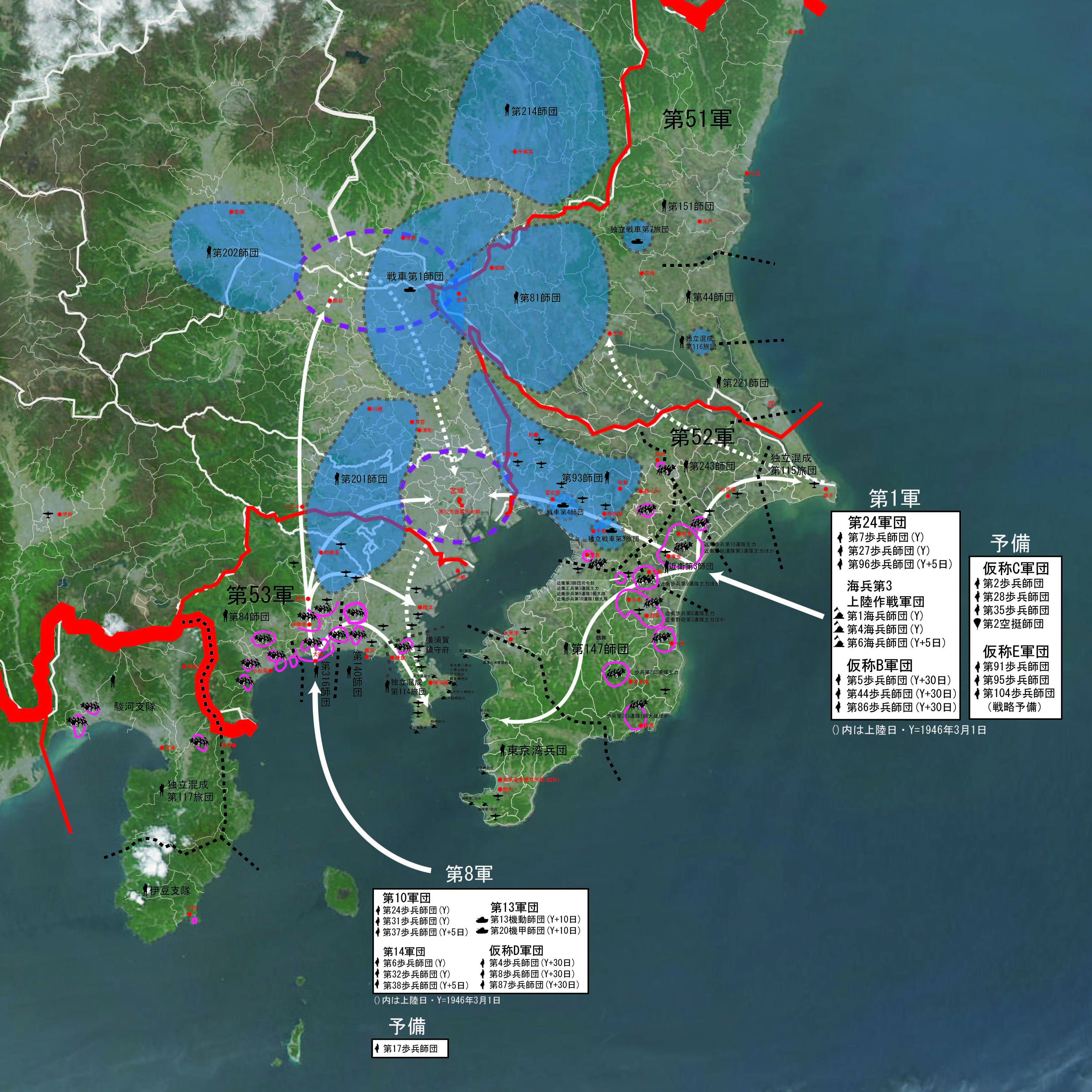 "코로넷 작전 시행 시, 도쿄 근처에 약 21개 사단, 간토 평야에 약 14개 사단과 충돌한다."[238]