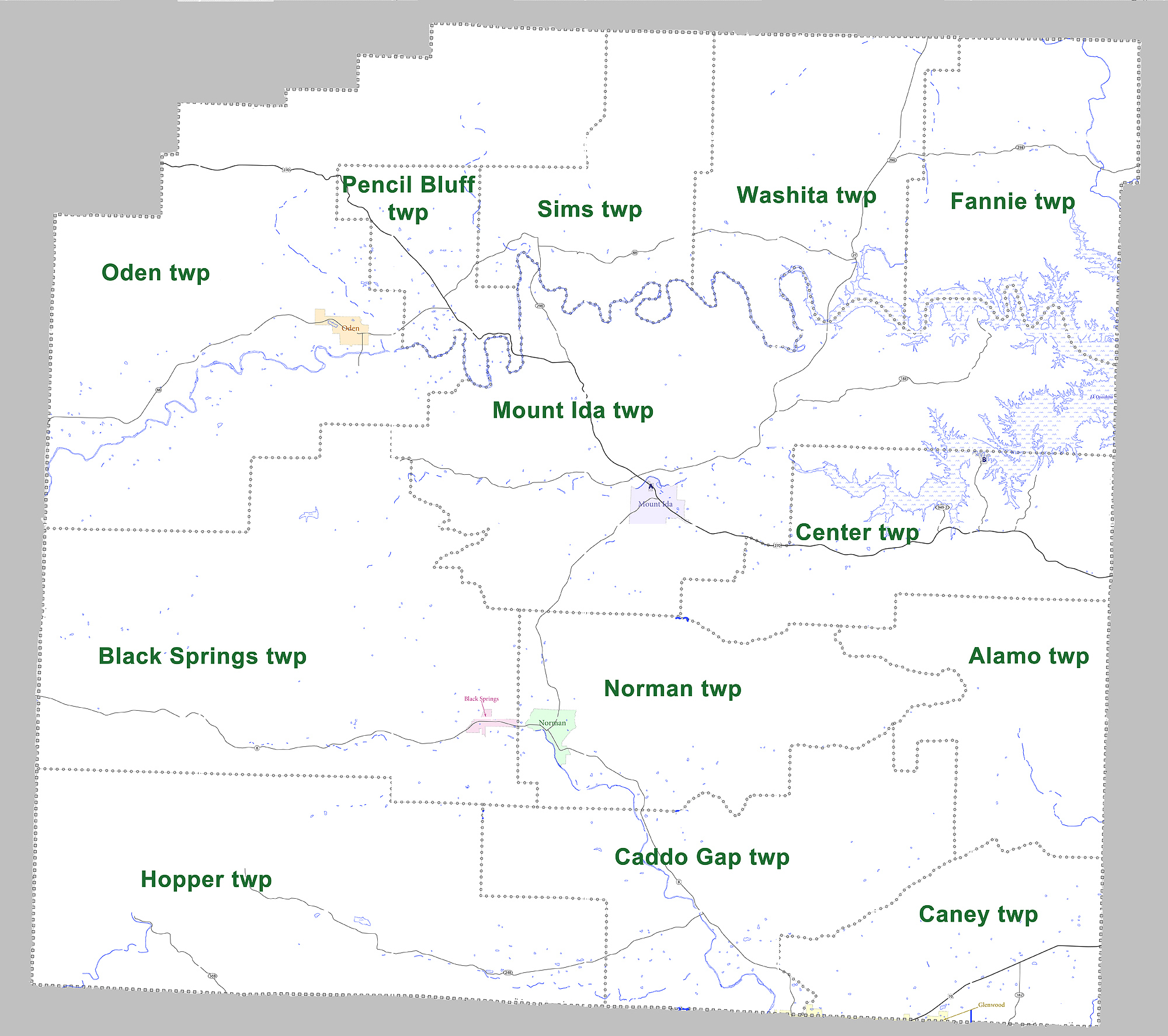 앨라모, 블랙 스프링스, 캐도 갭, 케이니 (일부 글렌우드), 센터, 패니, 호퍼, 마운트 아이다, 노먼, 오덴, 펜슬 블러프, 심스, 와시타는 몽고메리군의 비법인 지역이다.6. 5. 타운십