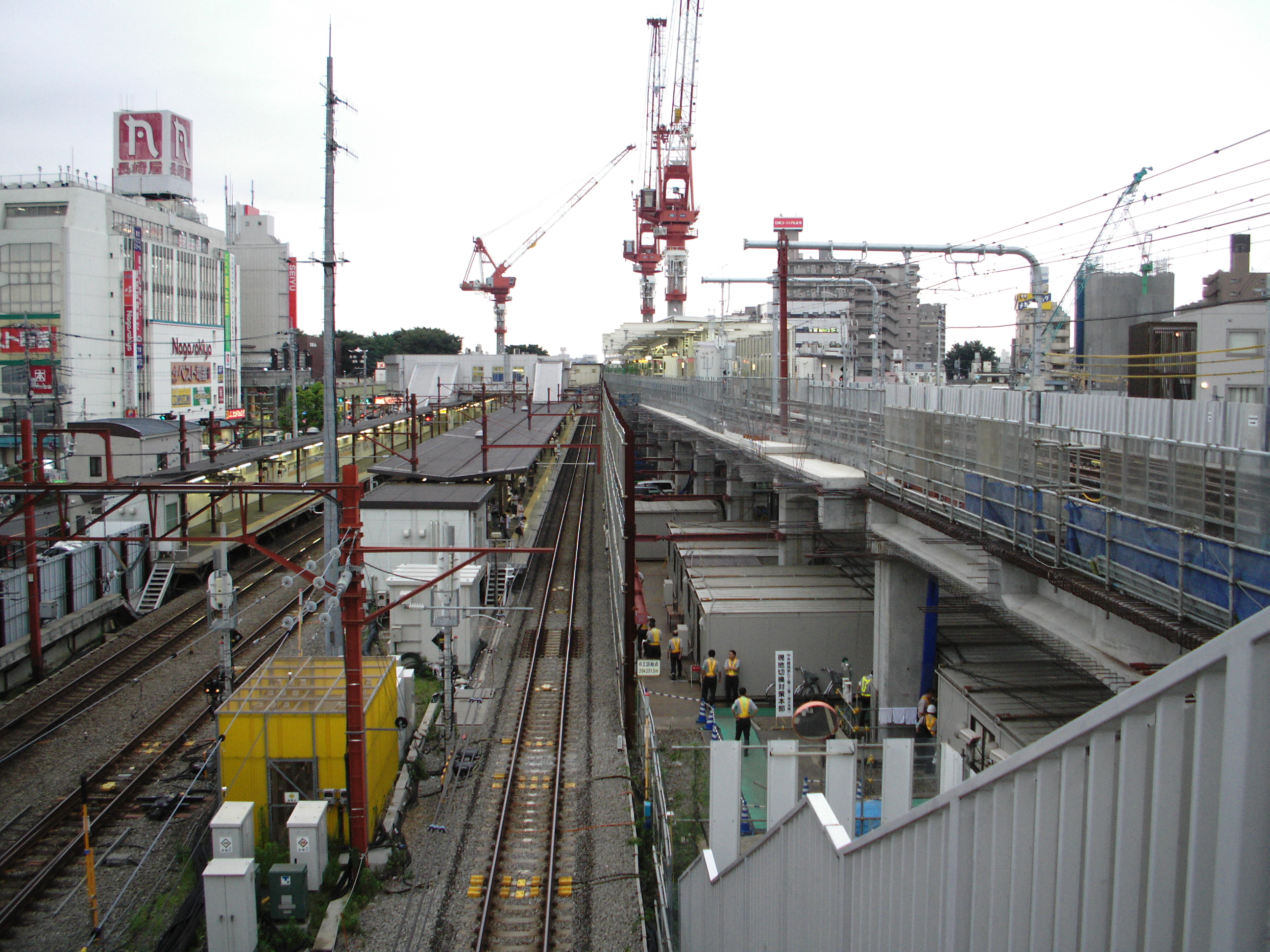 공사 시작 전에는 2면 3선(하행 방면이 단선)의 지상역이었지만, 북쪽 출구가 교상역사화된 후, 2003년 9월 28일부터 임시로 4면 4선이 되었고, 이듬해 2004년 7월 19일부터 2007년 6월 30일까지는 2면 3선(상행 방면이 단선), 2007년 7월 1일부터 2009년 12월 5일까지는 3면 4선(상행 방면이 지상에서 상대식, 하행 방면이 고가에서 섬식), 2009년 12월 6일부터 2012년 5월 19일까지는 2면 3선(상행선이 단선), 현재는 2면 4선(양쪽 모두 섬식)의 홈을 갖춘 역이 되었다.