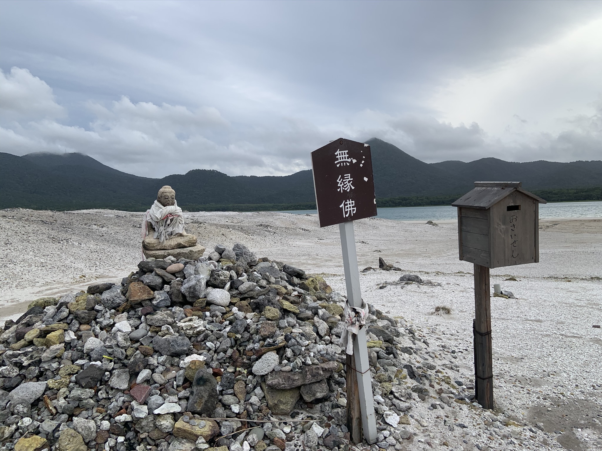 무연고 사망자를 위한 지장상과 돌무더기. 오소레잔