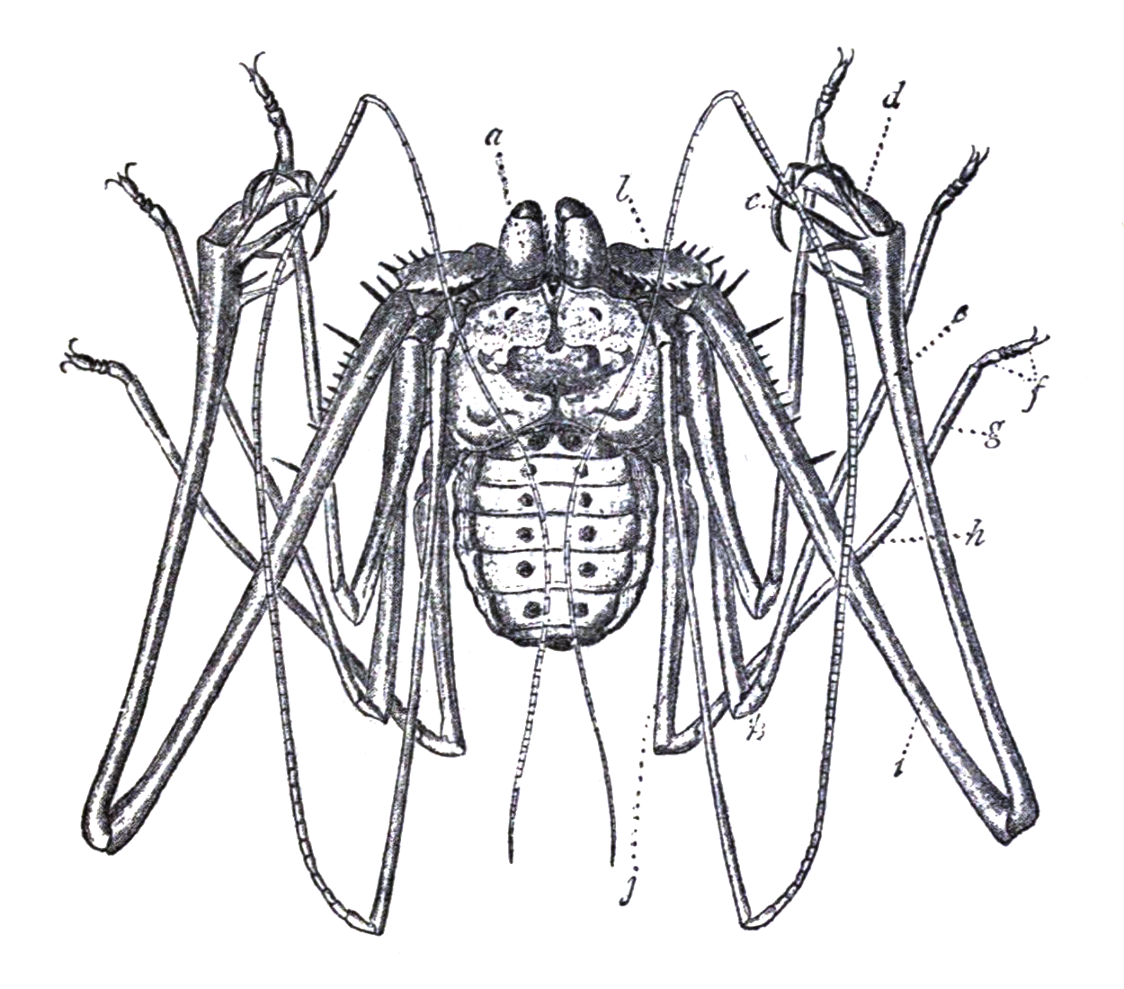 몸은 납작하며 다리가 길다. 더듬이다리는 먹이를 붙잡기 위한 용도로 발달하였으며 안쪽에 가시가 있다. 첫째 다리쌍은 무척 길며 촉각의 구실을 한다. 나머지 다리는 걷는다리이며, 옆으로 퍼져 있다. 꼬리는 없다.[26]
