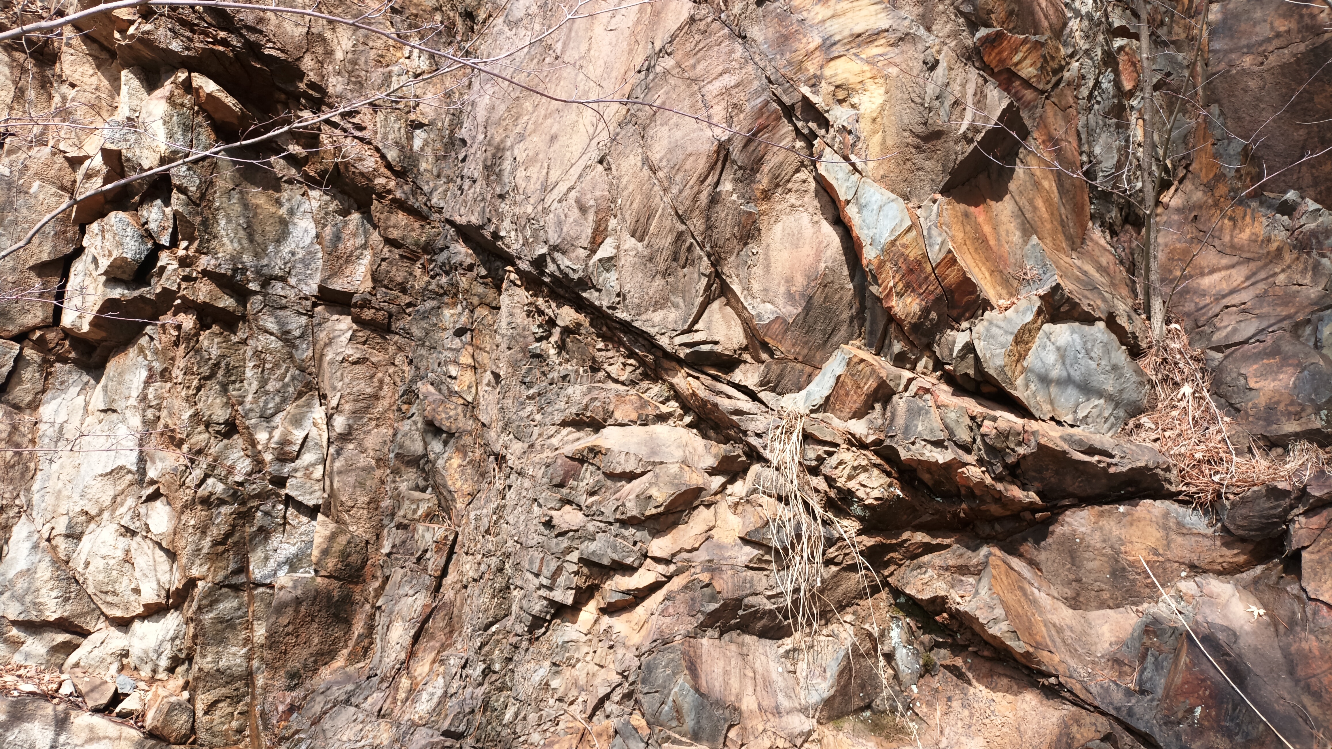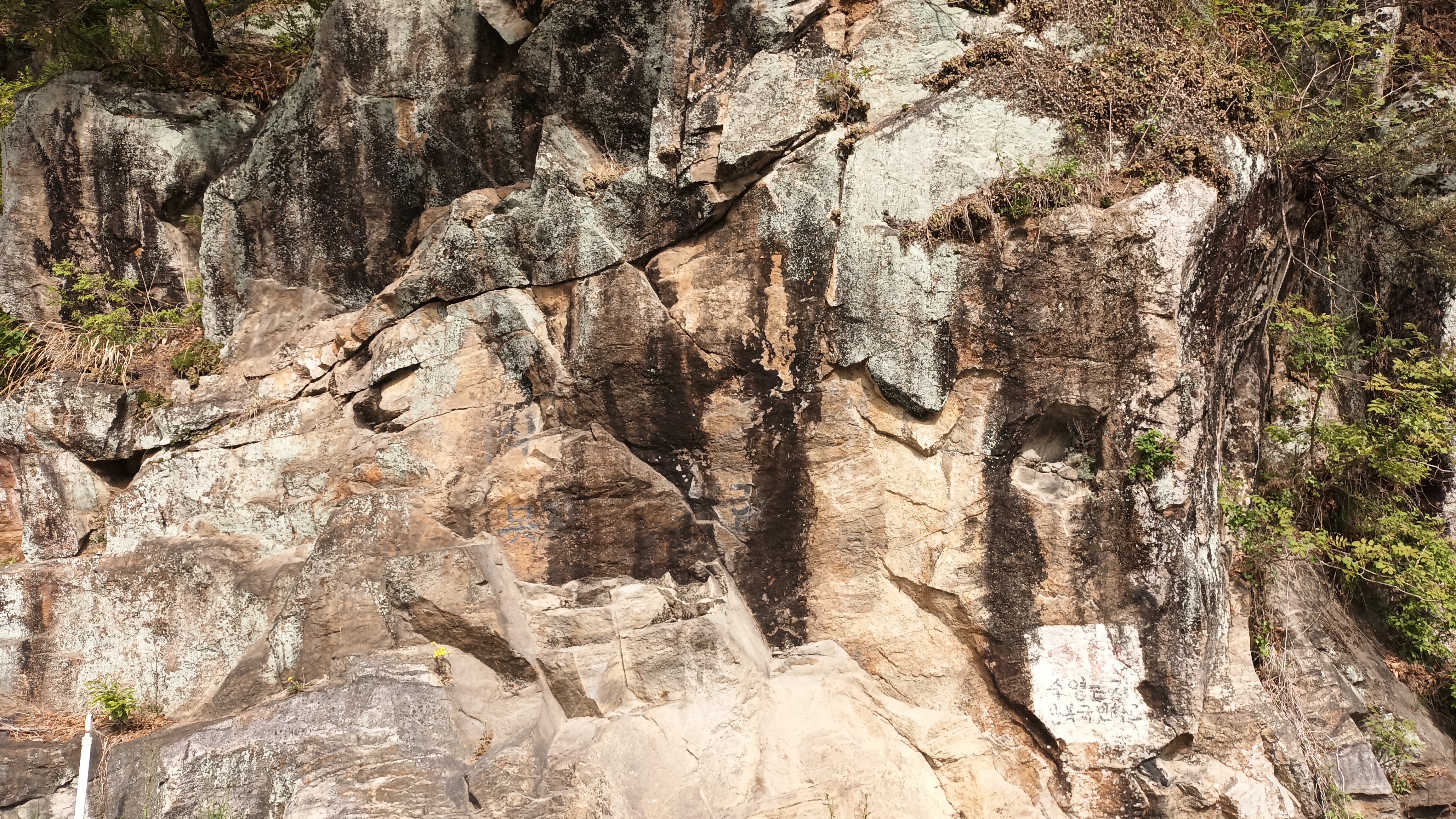 연천 단층북동 60°수직옥녀봉층과 조선계 대석회암층군, 홍점층이 접촉.