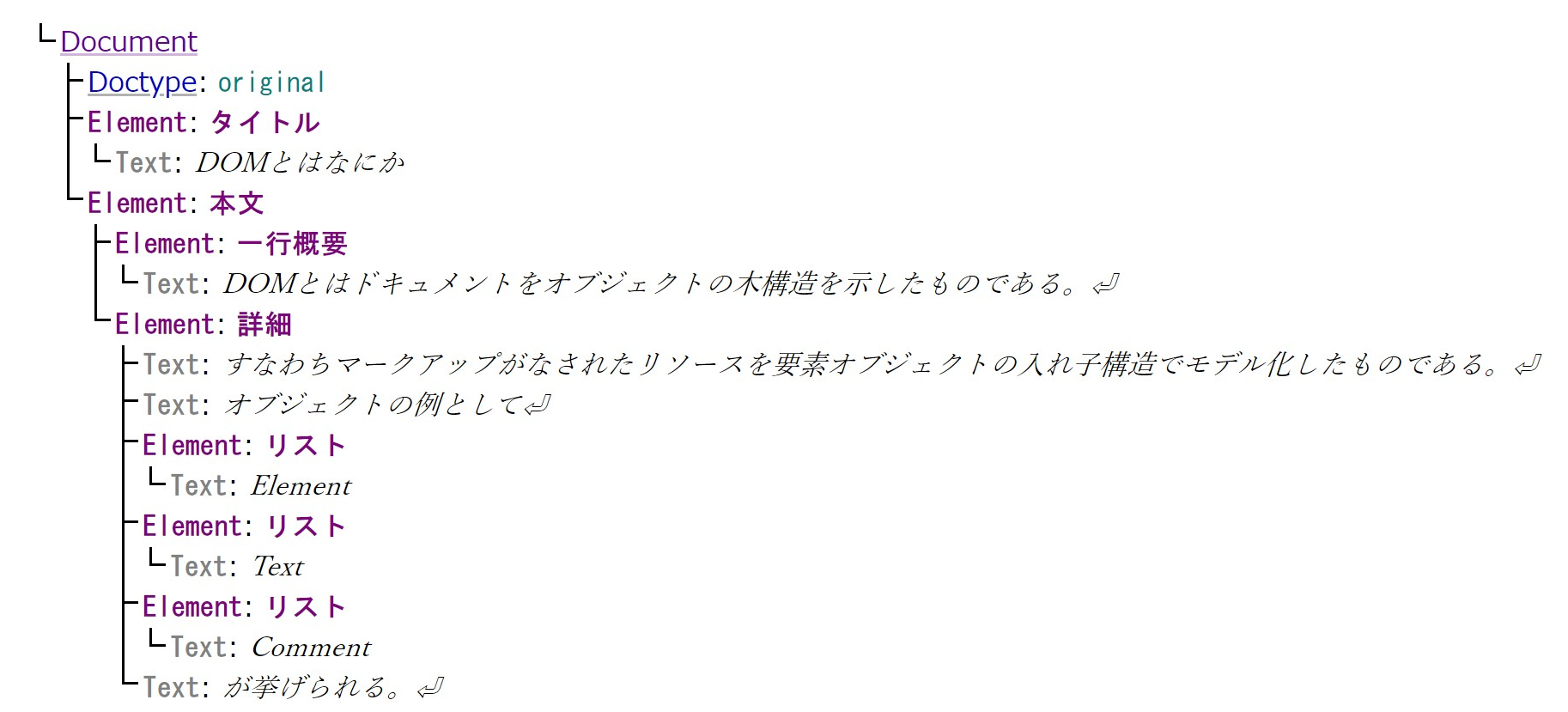 다음은 DOM을 설명하는 문장에 각 부분이 의미하는 내용을 마크업한 것이다.