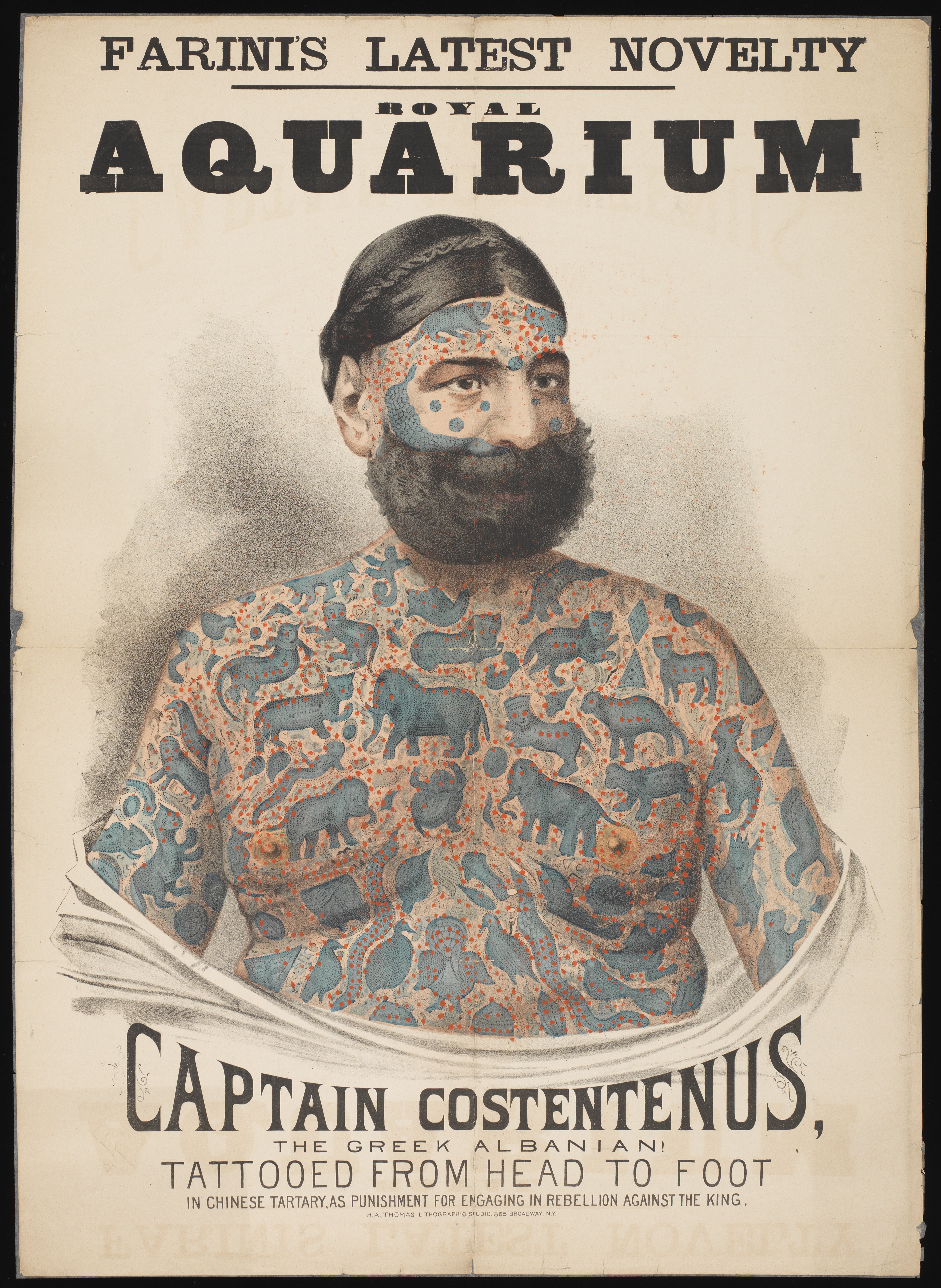 19세기에는 구경거리나 서커스의 엔터테이너 사이에서도 문신이 유행했다.[100][101] 1804년 장 바티스트 카브리가 문신을 하고 서커스를 한 것이 초기 예이다.[102] 1862년, 당시 왕태자였던 에드워드 7세는 예루살렘에서 다섯 개의 십자가와 세 개의 왕관 문신을 팔에 새겼다.[103] 조지 5세 (및 조지 5세의 사촌인 니콜라이 2세 (러시아 황제))도 일본에 들렀을 때 문신을 새겼다. 1889년에는 서더랜드 맥도날드가 영국 최초의 문신 전문점을 개업했다.[104] 19세기에 영국에서 오스트레일리아로 유배된 사람들 중 많은 수가 문신을 했다는 것도 확인되었다.[105]