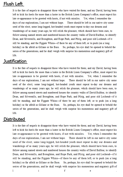 다음 표는 양쪽 정렬(왼쪽 및 오른쪽 정렬) 텍스트와 왼쪽 정렬 텍스트의 차이점을 보여준다.[3]