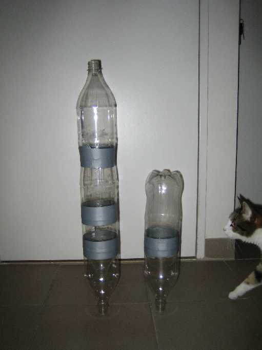 - '''수압 이용''': 물 호스를 페트병에 연결하여 물을 주입하면, 물이 병 안의 공기를 압축시킨다. 이때 공기 압력은 수도관의 압력과 같아진다.