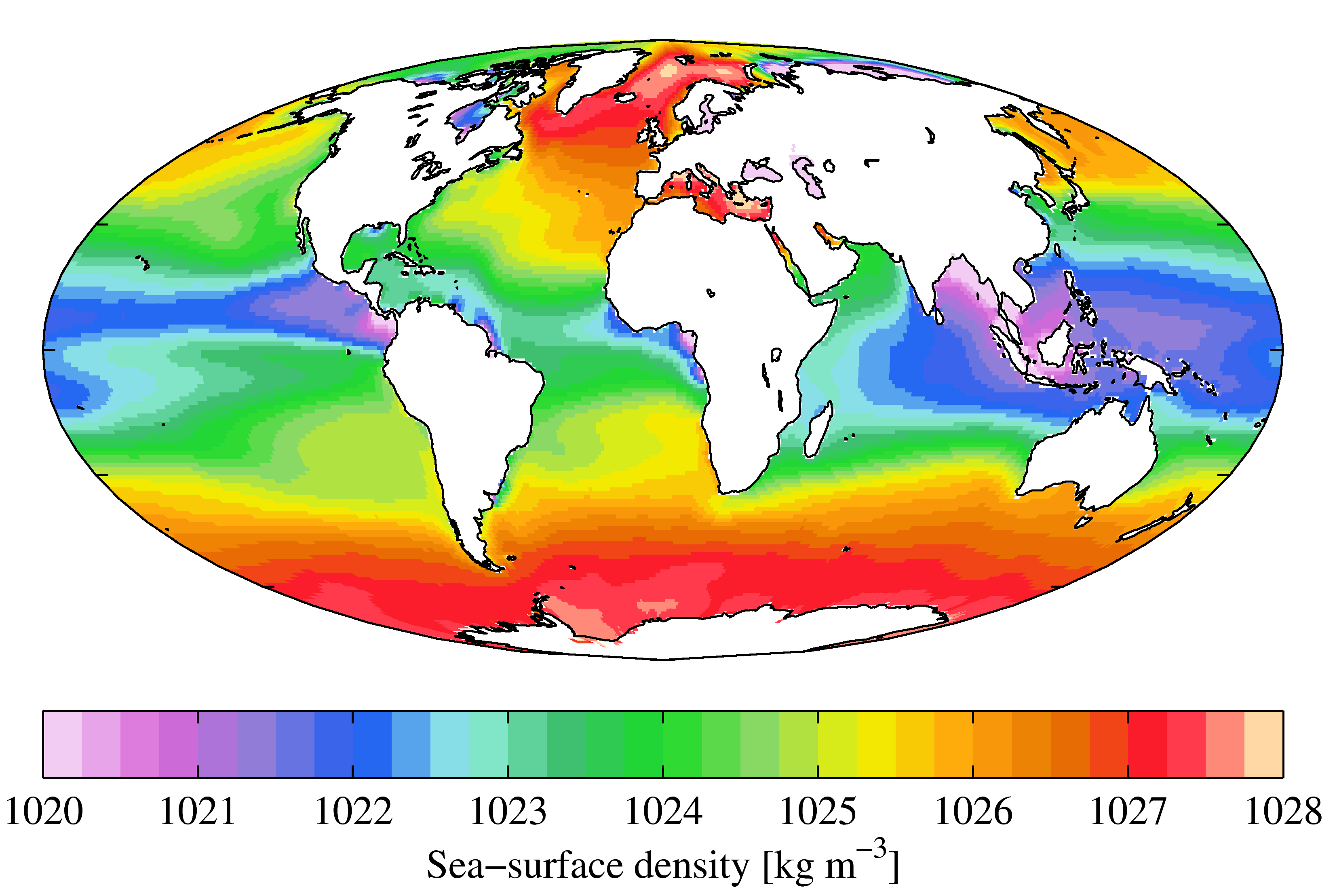 해수의 밀도는 주로 온도와 염분에 의해 결정되는데, 차갑고 염분이 높을수록 밀도가 높다. 이러한 밀도 변화는 해양에 층상 구조를 만들고, 열염분 순환을 유발하는 핵심 요인이다.[3]