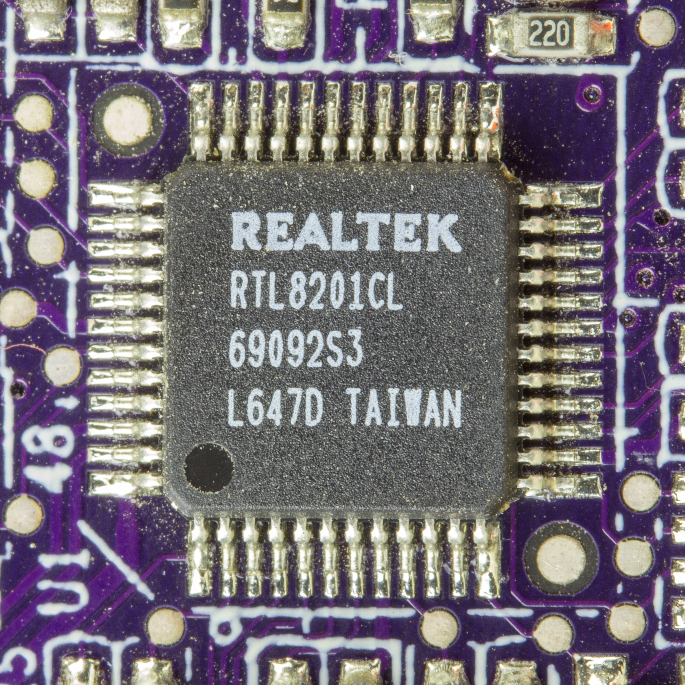 이더넷 PHY는 이더넷 데이터 프레임의 하드웨어 전송 및 수신 기능을 구현하는 칩이며, 이더넷의 회선 변조의 아날로그 도메인과 링크 계층 패킷 신호의 디지털 도메인 사이를 연결한다.[17] PHY는 일반적으로 MAC 주소를 처리하지 않으며, 이는 데이터 링크 계층의 역할이다. 마찬가지로, Wake-on-LAN 및 부트롬 기능은 PHY, MAC 및 기타 기능을 하나의 칩 또는 개별 칩으로 통합할 수 있는 네트워크 인터페이스 카드 (NIC)에 구현된다.