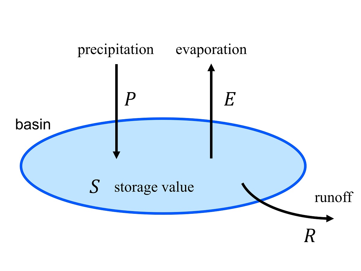 수문학에서는 기본적인 지역 단위로 유역이 사용된다. 유역 단위에서의 물의 유입에는 강수, 유출에는 증발산과 유출이 있다. 강수량을 P영어, 증발산량을 E영어, 유출량을 R영어로 하여 물수지식에 대입하고, 지정된 시간으로 적분하면 다음 식이 얻어진다. (단, ΔS영어는 적분 시작 시점과 종료 시점에서의 저류량 변화이다.)[5]