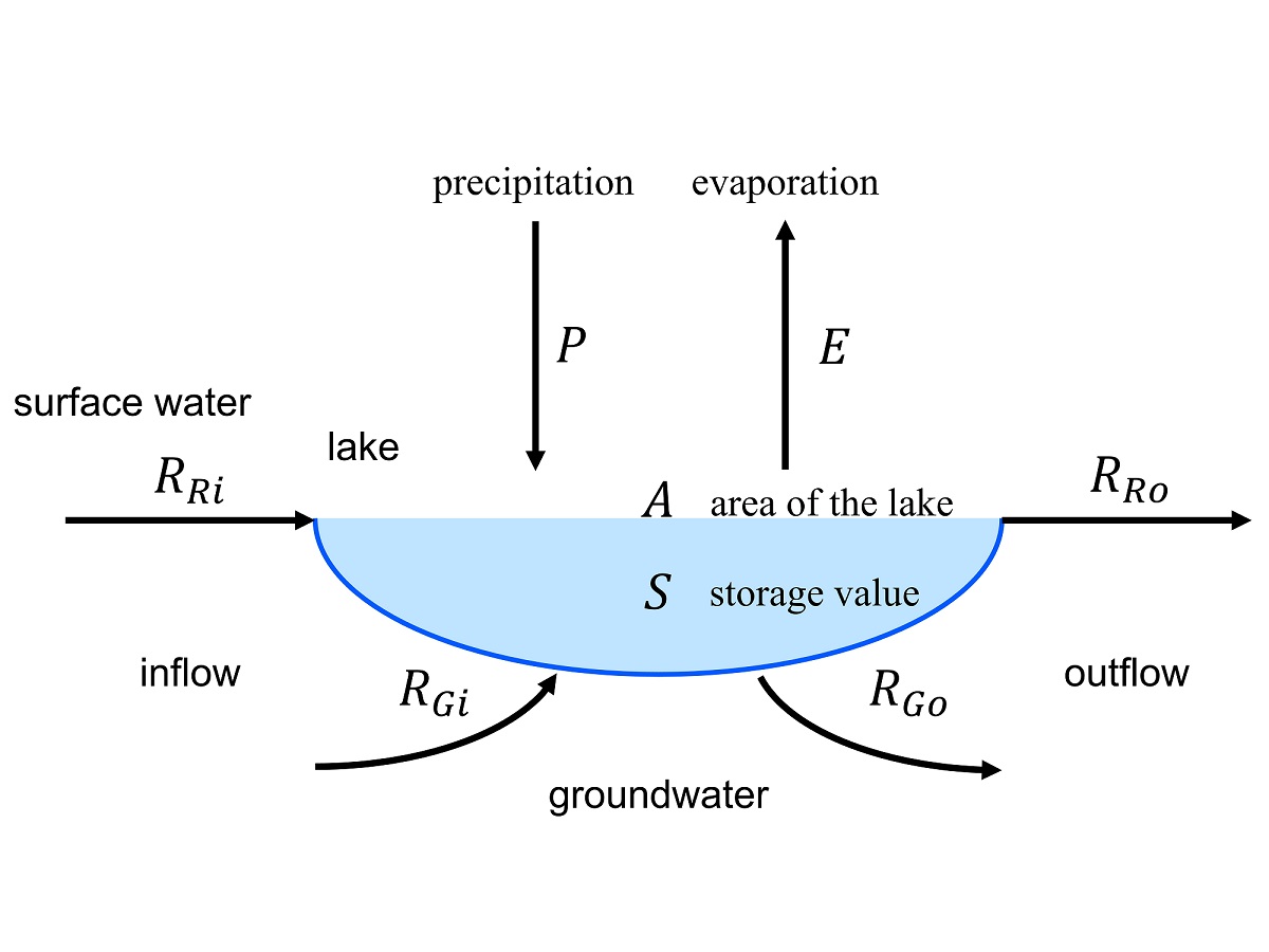 :\frac{dS}{dt}= ( P - E ) A + ( R_{Ri} - R_{Ro} ) + ( R_{Gi} - R_{Go} )