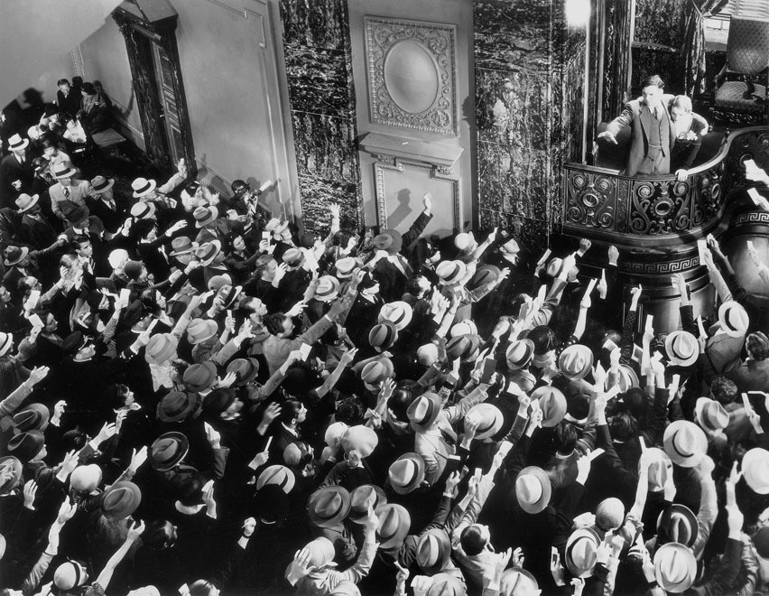 월터 휴스턴과 컨스턴스 커밍스가 흥분한 예금자들을 마주보고 있다.