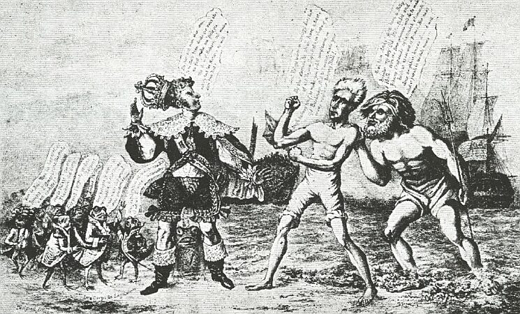 1835년 제임스 에이킨(James Akin)의 풍자 만화. 앤드루 잭슨 대통령이 왕관이 떨어지려는 프랑스 국왕 루이 필리프 1세에게 도전하는 모습을 보여준다. 잭슨은 해왕 넵투누스의 조언을 받고 미국 군함의 지원을 받고 있다. 왼쪽에는 미국인을 비난하는 작은 개구리로 묘사된 프랑스 정치인들이 있다.