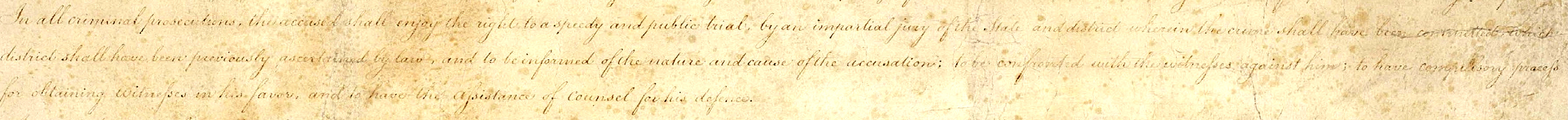 In all criminal prosecutions, the accused shall enjoy the right to a speedy and public trial, by an impartial jury of the State and district wherein the crime shall have been committed, which district shall have been previously ascertained by law, and to be informed of the nature and cause of the accusation; to be confronted with the witnesses against him; to have compulsory process for obtaining witnesses in his favor, and to have the Assistance of Counsel for his defense.영어