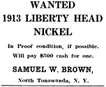 리버티 헤드 니켈은 1912년 말을 끝으로 공식적인 생산이 중단되었다. 그러나 1913년 연도가 새겨진 리버티 헤드 니켈이 극소수 존재한다는 사실이 알려지면서 큰 화제가 되었다. 1919년 12월, 동전 판매상 새뮤얼 W. 브라운(Samuel W. Brown)이 화폐 수집 관련 잡지에 1913년 리버티 헤드 니켈을 구매하겠다는 광고를 낸 것이 시작이었다. 이듬해 그는 미국화폐학회(ANA) 연례 총회에 실제로 1913년 니켈을 가지고 나타났다.