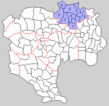 - '''하나하타촌'''(花畑村): 하나마타촌, 나카츠쿠리신덴, 무츠키무라, 큐사에몬신덴, 나가사에몬신덴, 큐우에몬신덴, 카베에신덴, 타츠누마신덴
