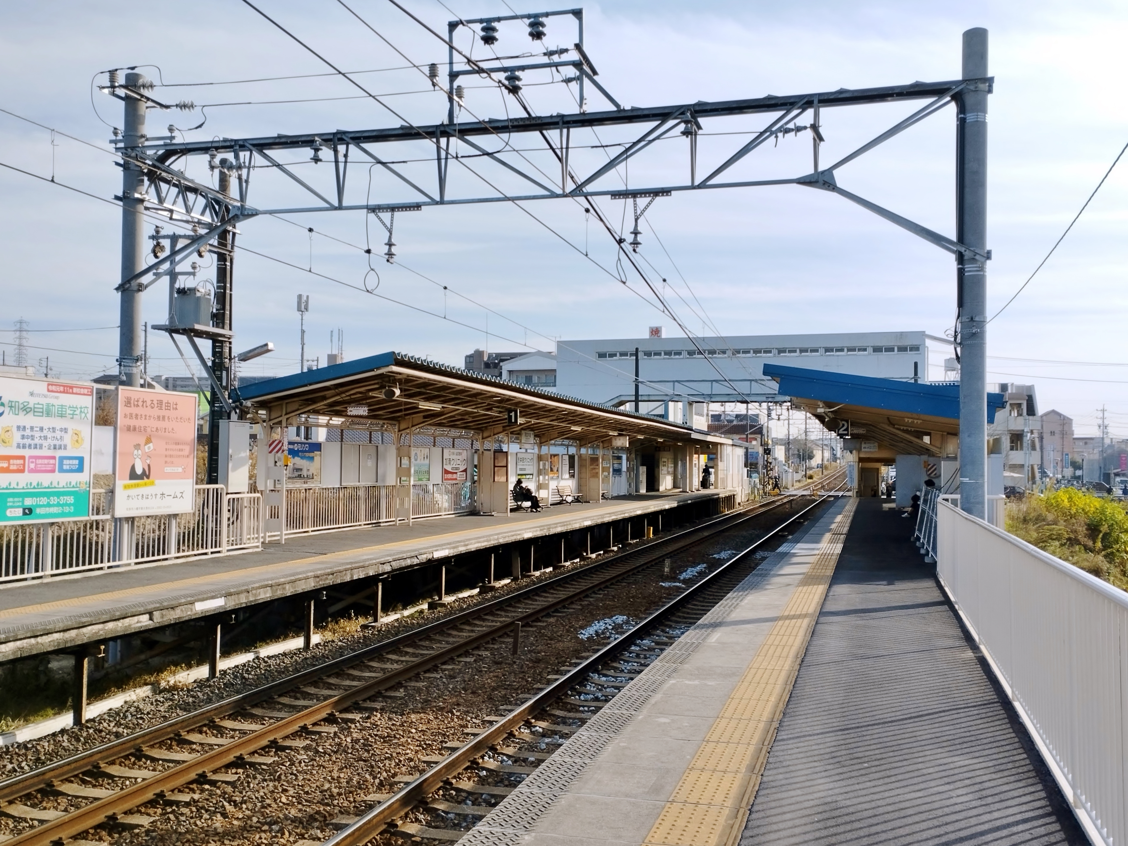 이 역은 2개의 마주보는 상대식 승강장을 갖추고 있으며, 육교로 연결되어 있다. 역에는 자동 매표기, manaca 자동 개찰구가 있었다. 2023년 12월 22일까지는 종일 역무원 배치역이었으며, 하행선 승강장 출입구 쪽에 창구가 있었다.8량 편성 대응의 상대식 승강장 2면 2선을 갖춘 지상역으로, 역 집중 관리 시스템을 도입한 무인역이다(관리역은 오타가와역). 개찰구는 각 승강장의 지타한다 방면에 있으며, 자동 발권기(manaca 정기 승차권 구매 가능, 메이테츠 뮤즈 카드 결제는 7:00 - 22:00로 제한), 자동 정산기를 갖추고 있다. 또한, 과선교로 승강장 간의 이동을 할 수 있다.