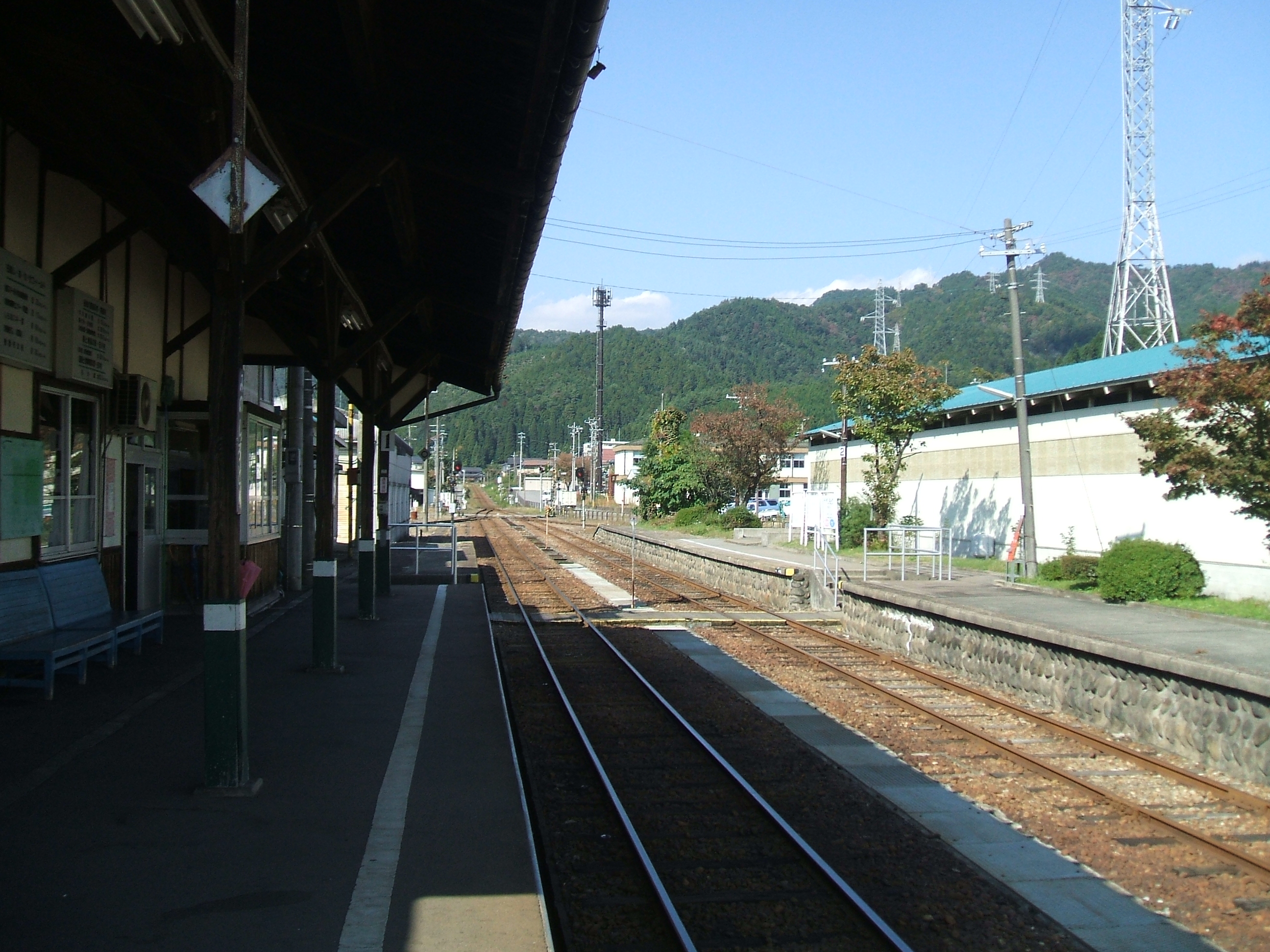 상대식 승강장 2면 2선을 갖춘 열차 교환이 가능한 지상역이다. 교환이 없으면 방향에 관계없이 역사 측 1번 승강장에 발착한다. 에쓰미난 선의 운행상 중요한 역할을 담당하고 있으며, 구내에는 넓은 측선 및 차고가 있으며, 야간 체박이 설정되어 있다. 구조 하치만 방면에서 도착하는 열차의 일부는 당역 종착이며, 이 중 14:51에 도착하는 열차는 승강장에서 1시간 반 정도 엔진을 끄고 유치한 후 16:20 발 기타노 행으로 운행된다. 또한, 휴일에 한하여, 하루에 한 번 승무원 교대가 있다.