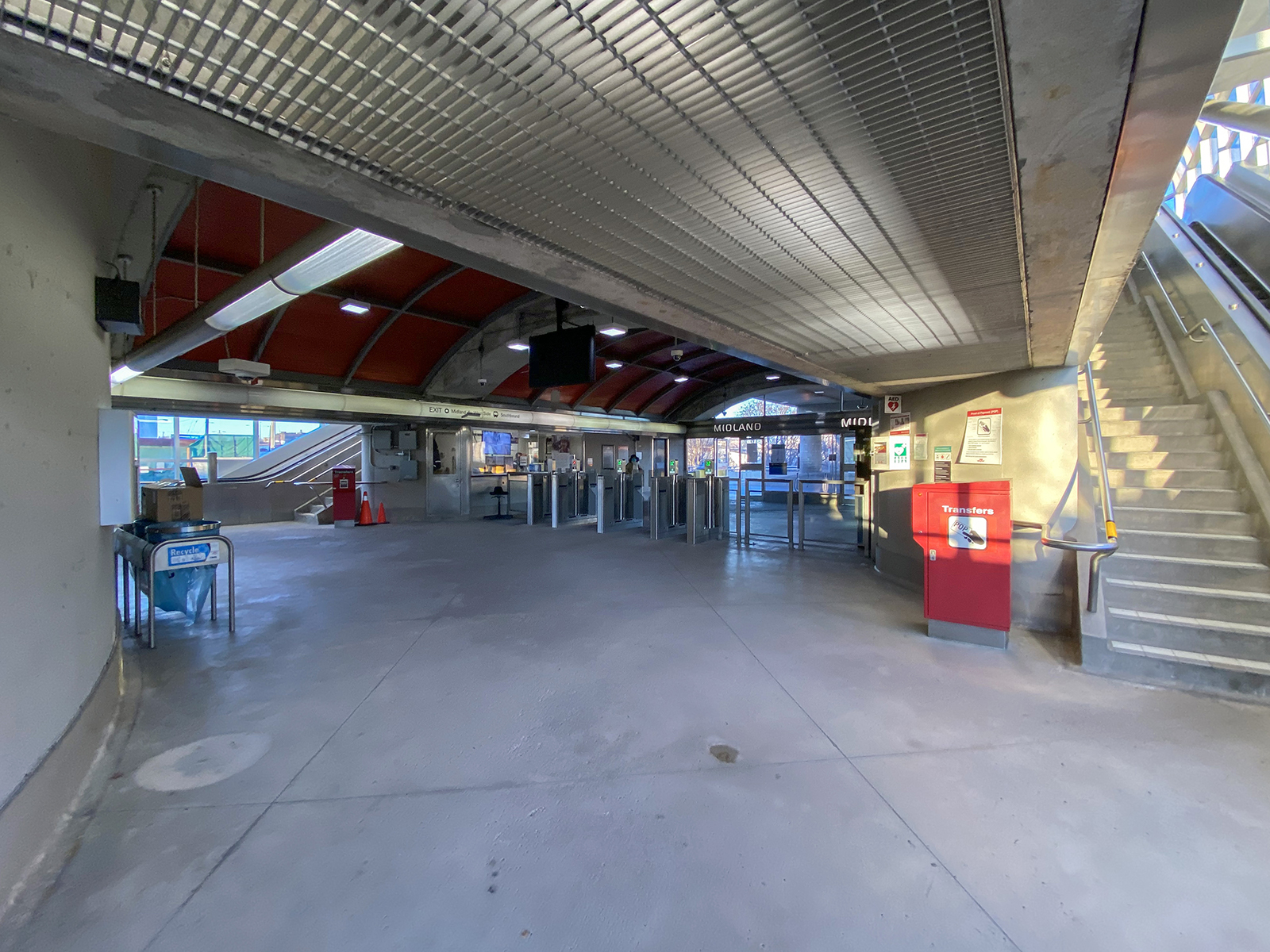 역 동쪽 출입구가 무인 출입구로 대체된 이유는 예산 절감 목적이었다.[6] 공사 당시, 지역 정치인과 지역 주민들은 동쪽 출입구를 이용하는 사람들이 횡단보도도 없는데 역을 어떻게 이용하겠냐며 질타하였다.[6] 동쪽 출입구가 무인으로 대체되면서 동쪽 출입구에 있던 환승 표 발권기는 역 이름을 "MIDLAND STATION - Automatic Entrance" (미들랜드역 자동 출입구)라고 표시하였다.[6]