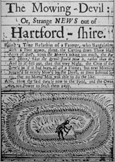 1678년 영국에서 발간된 낫질 악마: 또는 하트퍼드셔에서 온 이상한 소식이라는 뉴스 팸플릿에는 줄기가 잘린 곡물이 묘사되어 있다.[24]