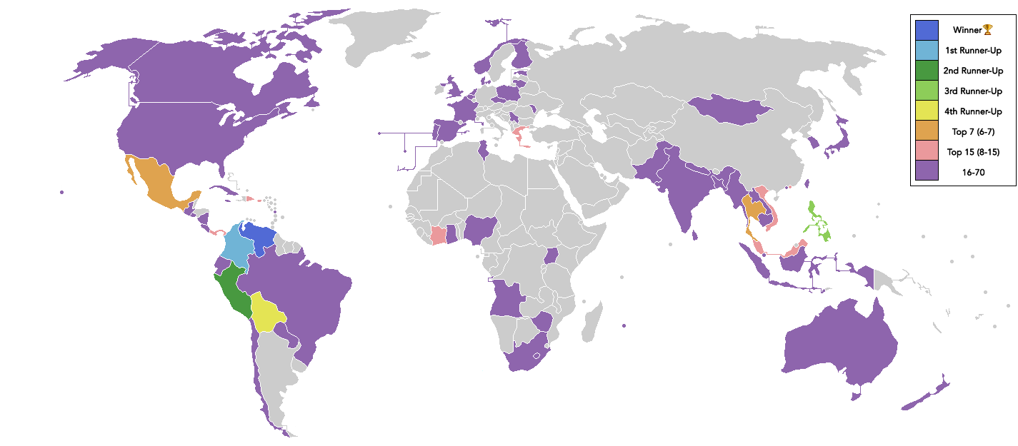 국제 문화 협회는 참가자 수를 80명으로 제한했지만, 최종적으로 70개 국가 및 지역 대표들이 대회에 참가했다. 왕관을 박탈당하거나 개인적인 사유로 직위를 포기한 참가자들을 대신하여 새로운 참가자들이 선발되었다.