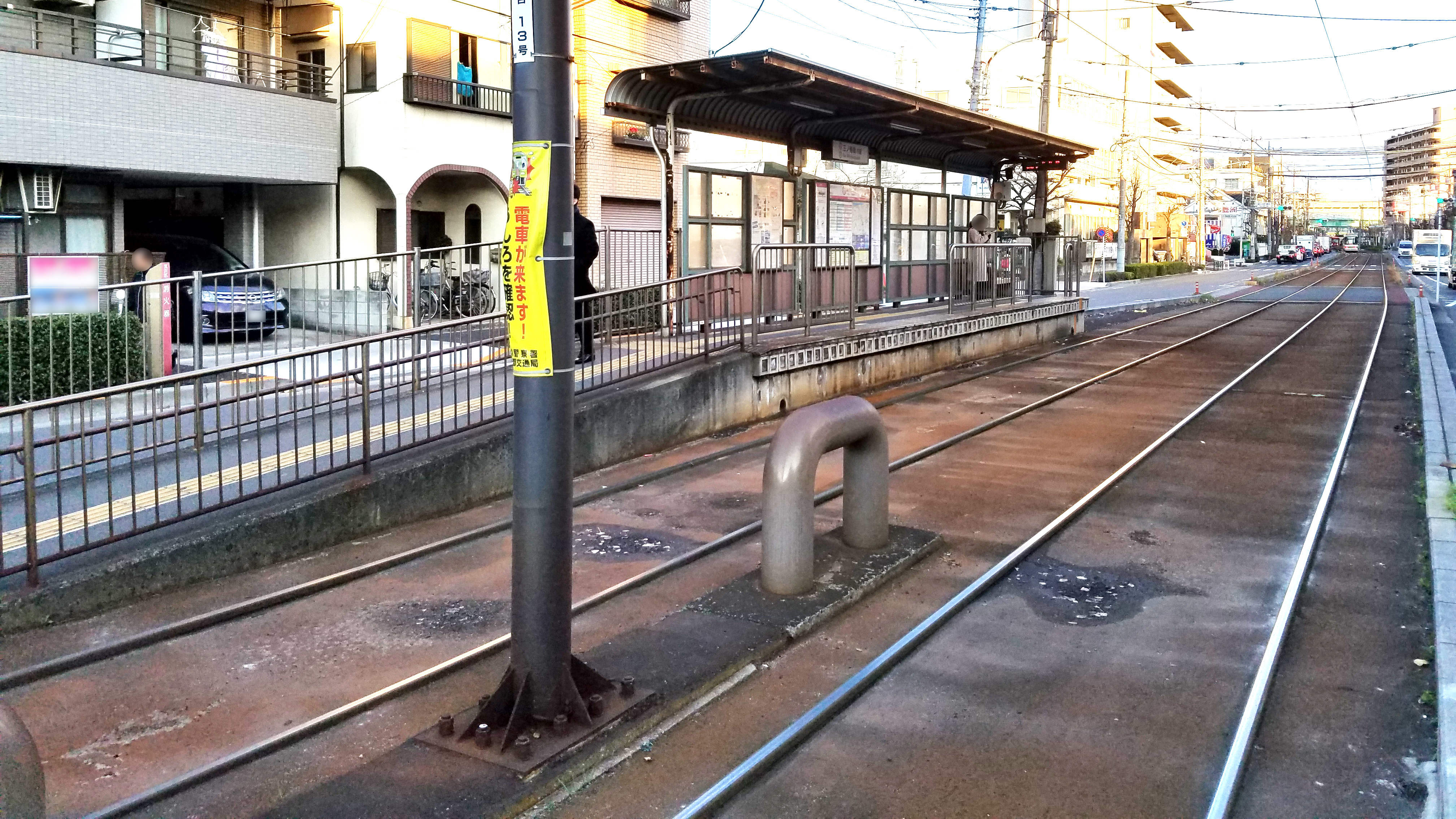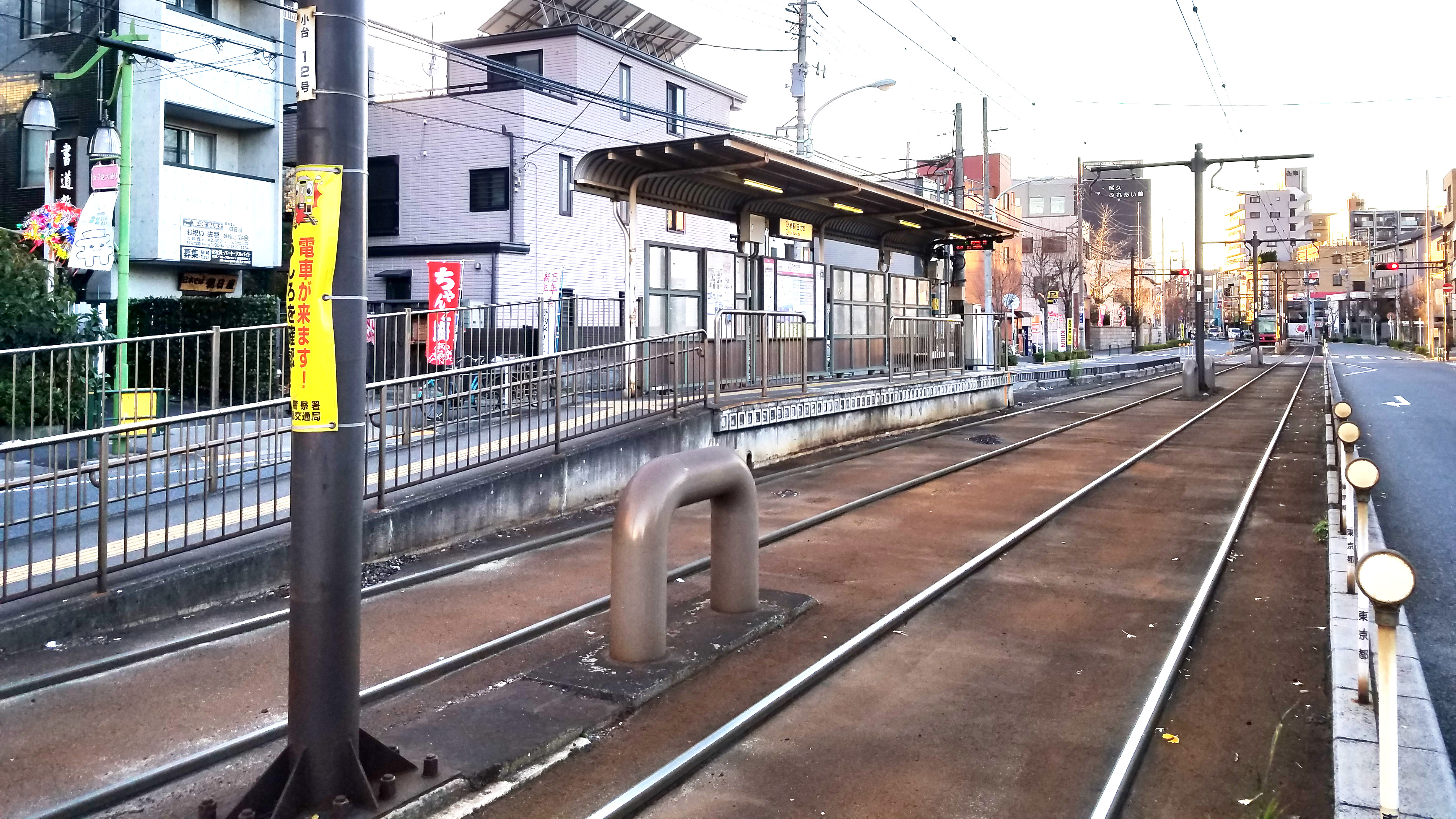 상대식 승강장 2면 2선의 지상역 구조이다. 두 개의 플랫폼은 다소 떨어져 있다. 아라카와 선에서 유일하게 플랫폼이 상하행 모두 도로 위에 있는 정류장이다.현재는 차도와 궤도 부지 사이에 플랫폼이 있지만, 센터 리저베이션화되기 전에는 궤도 부지가 세워졌고 보도의 일부가 플랫폼으로 인상된 형태였다.
