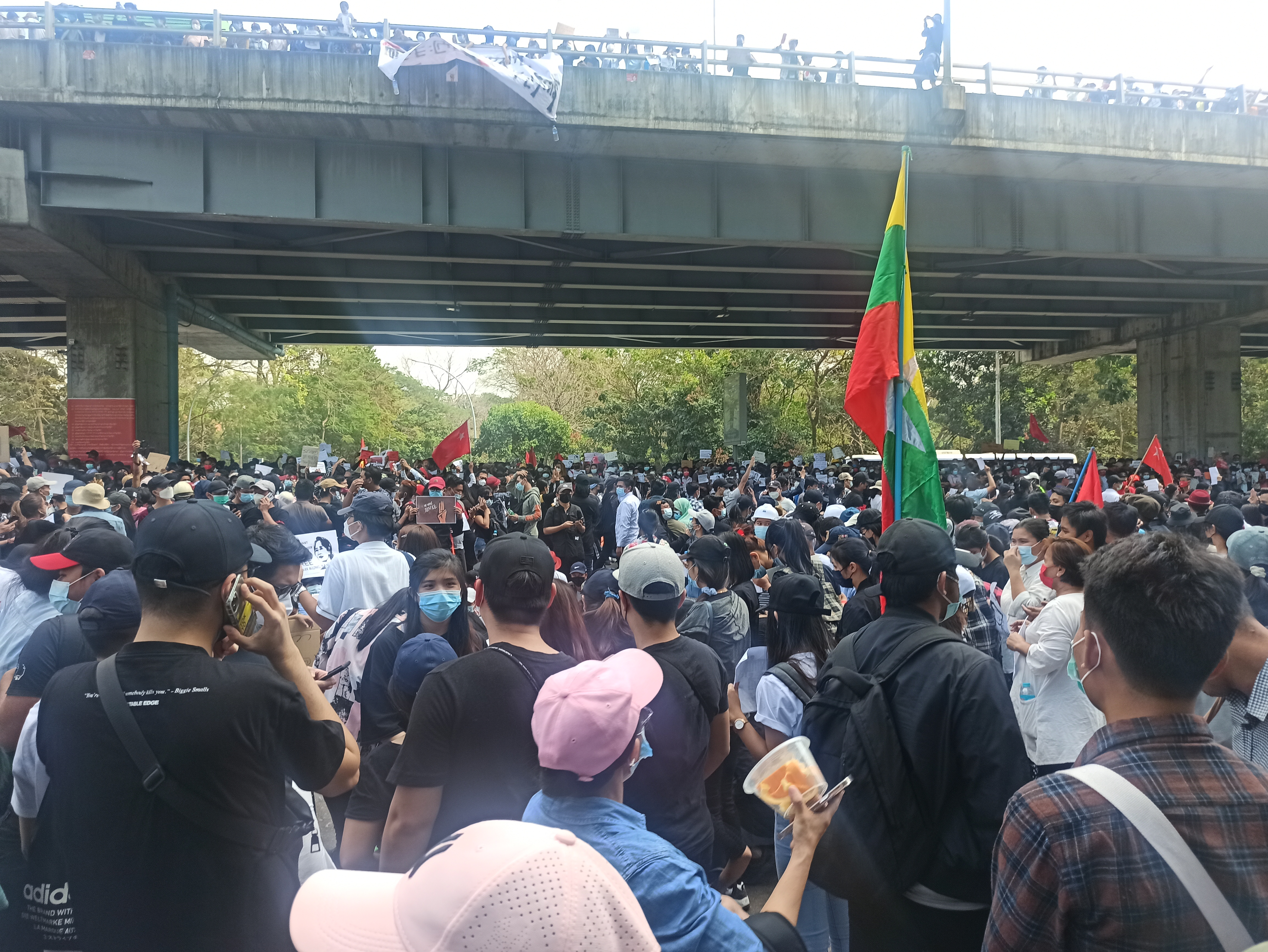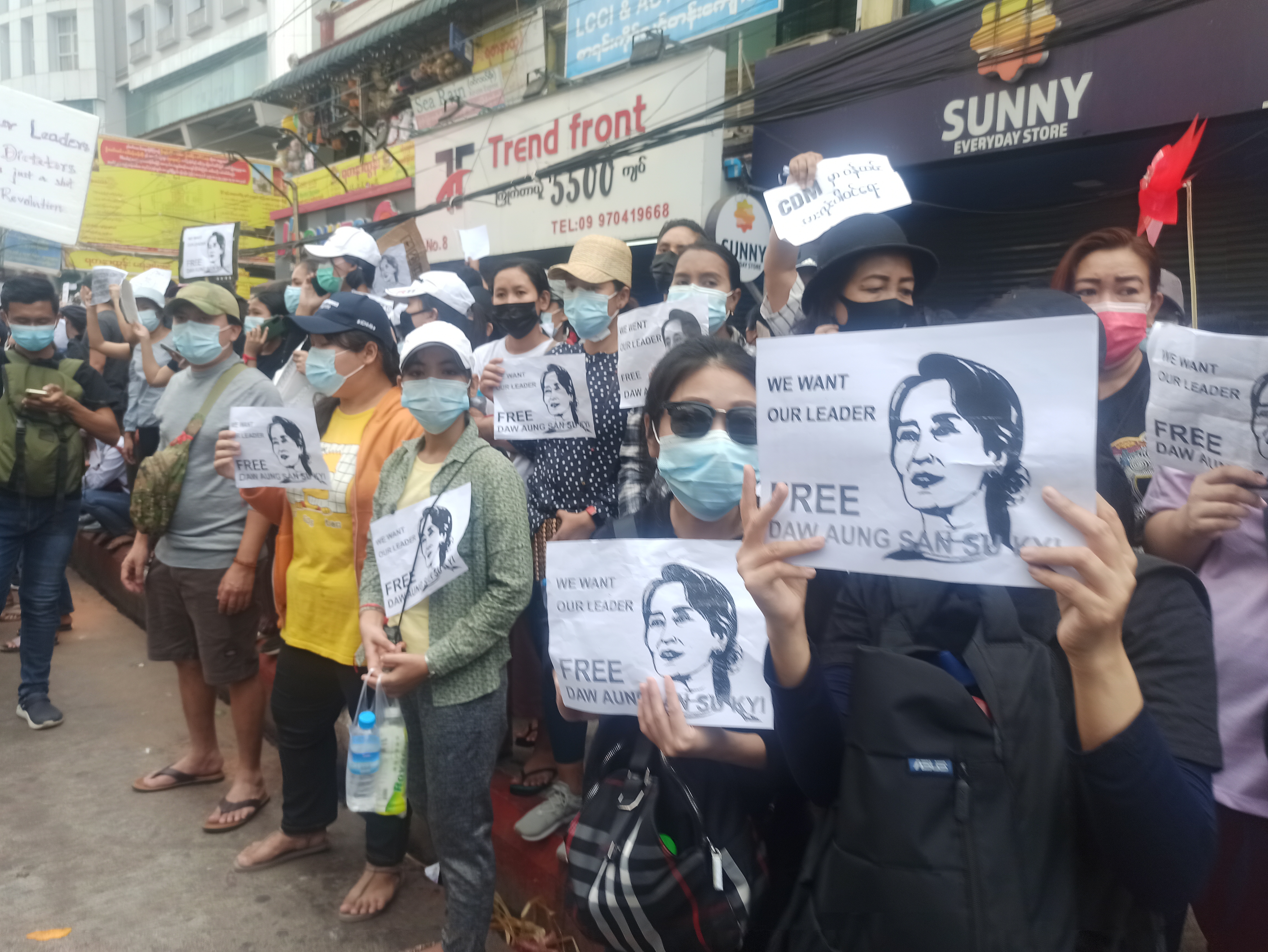 쿠데타에 반대하는 첫 시위는 2월 2일에 발생했으며,[170] 2월 4일에는 만달레이 의과대학 앞에서 30명의 시민이 쿠데타에 반대하는 시위를 벌여 4명이 체포되었다.[203][204] 이후 시위는 전국적으로 확산되었으며, 양곤에서는 최소 15만 명이 참여하는 대규모 시위가 열렸다.[205][84]