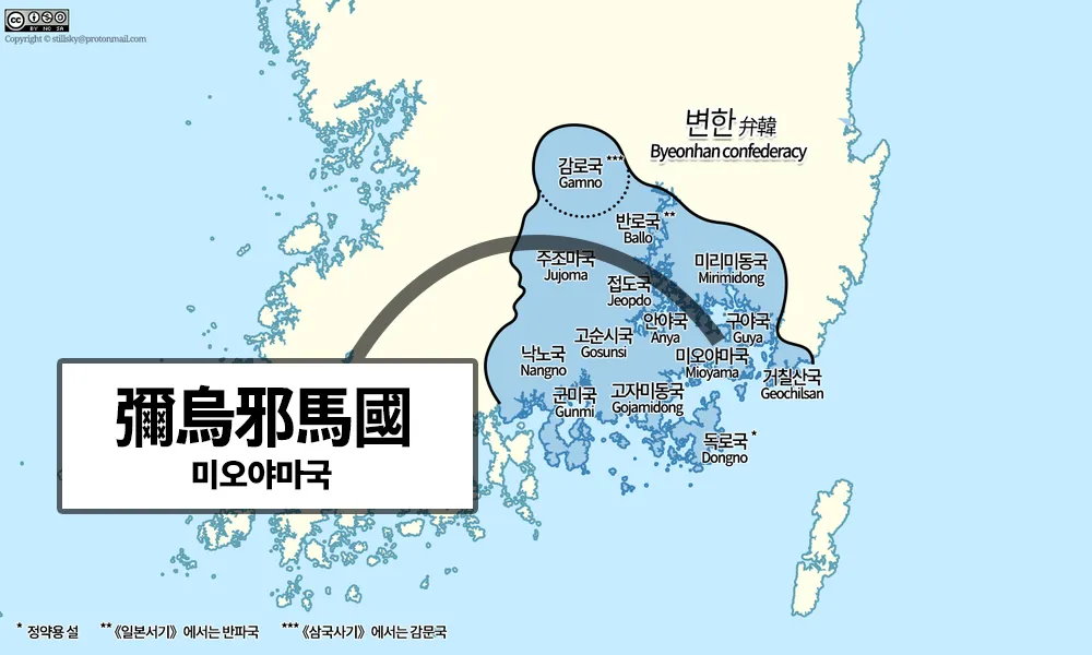 일부 언어학자들은 당시 변한에서 발견된 소국들의 이름과 일본어의 유사성을 지적해 왔다. 이 이론에 따르면, 두 개의 소국에는 접미사 彌凍|미토일본어이 포함되어 있는데, 이는 중세 후기 한국어 와 원시 일본어 *와 비교되었으며, 둘 다 '기초, 바닥'을 의미한다. 특히 미오야마에는 접미사 邪馬|야마일본어가 있는데, 이는 일반적으로 원시 일본어 '산'과 동일하게 간주된다.