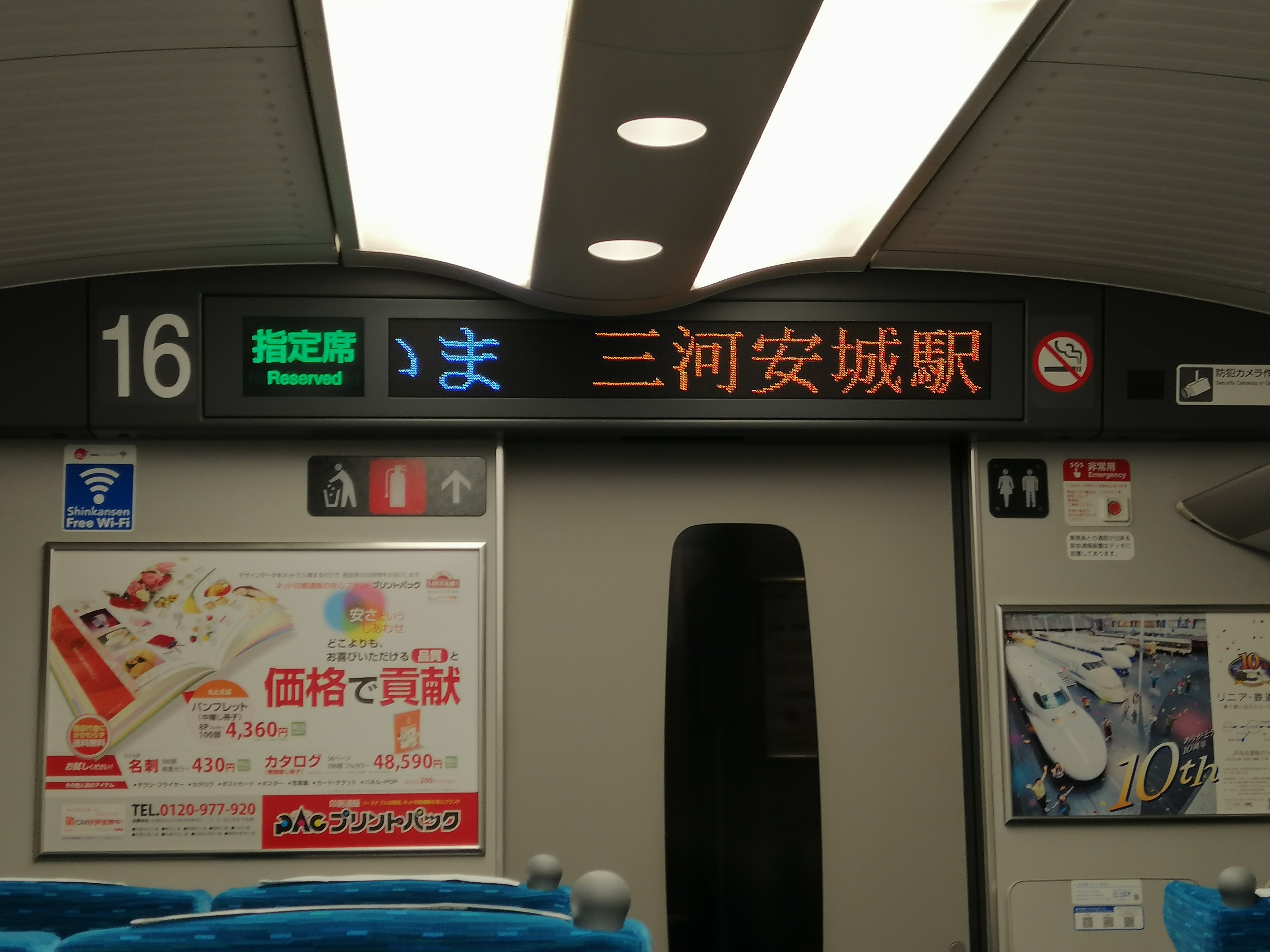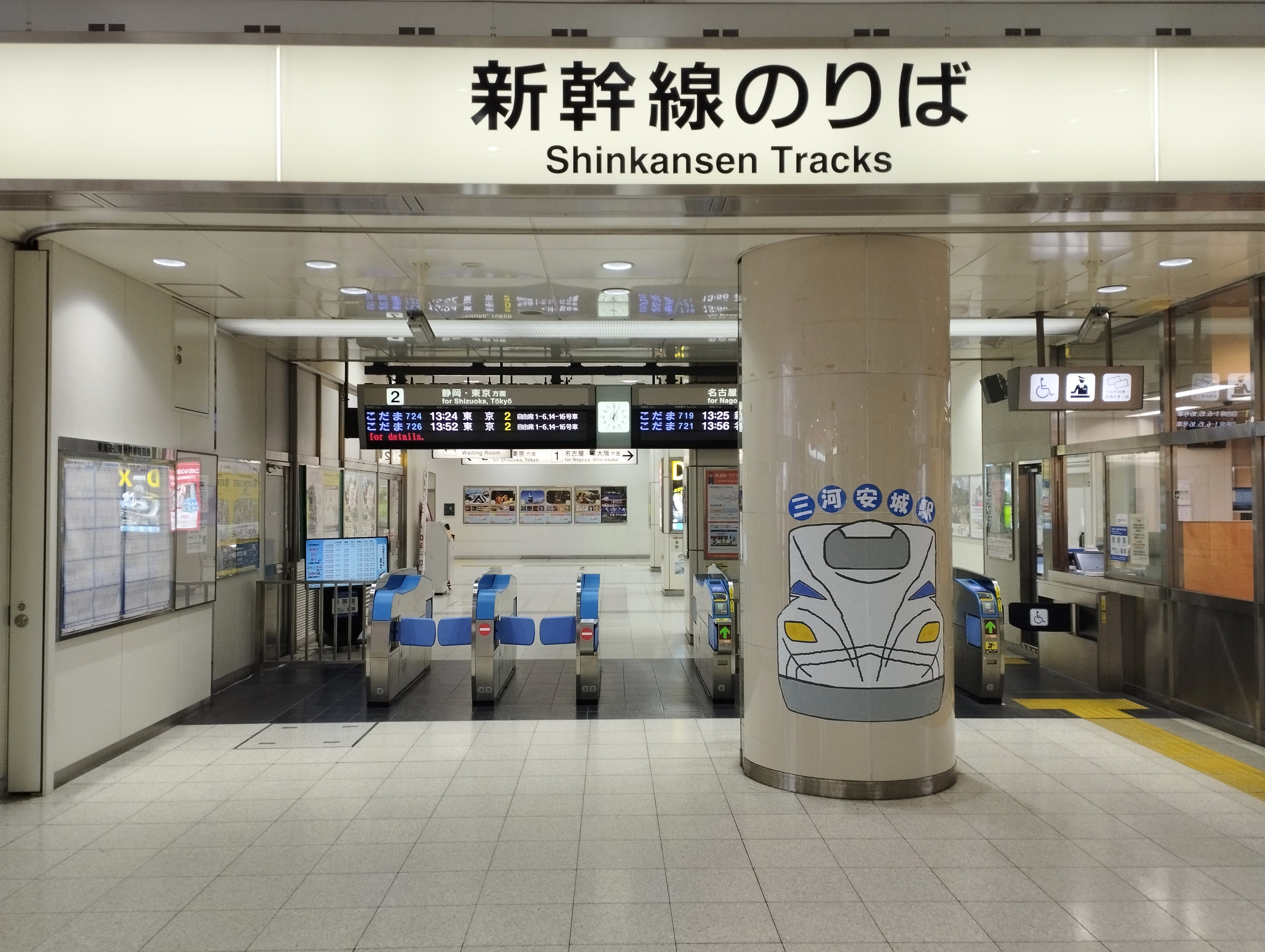 하행 "노조미" "히카리"는 이 역을 통과할 때 "미카와안조역을 (시간대에 따라) 통과했습니다. 앞으로 9분 뒤에 나고야에 도착합니다."와 같은 안내 방송을 한다.[8]