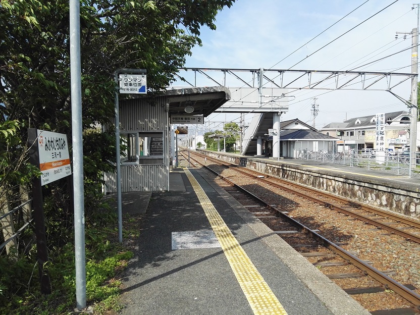 이 역은 상대식 승강장 2면 2선을 가진 지상역이다. 승강장은 태블릿 교환(현재는 이루어지지 않음)을 쉽게 하기 위해[11] 1번 승강장을 이다 방면으로, 2번 승강장을 도요하시 방면으로 각각 어긋나게 배치했다.[11][12] 단선 위에 있는 교환역이며, 열차 교환(엇갈림)이 가능하다. 배선은 일선 스루 방식이지만, 신호 설비의 사정상 속도 제한을 받지 않는 것은 도요하시 방면으로 향하는 열차뿐이다.구내 동쪽・상행(1번선) 승강장에 직결하여 역사가 설치되어 있다[12]。이 역사는 현관의 차양 부분에 신사의 구조를 본뜬 구조를 가지고 있다[11]。서로의 승강장은 육교로 연결된다.