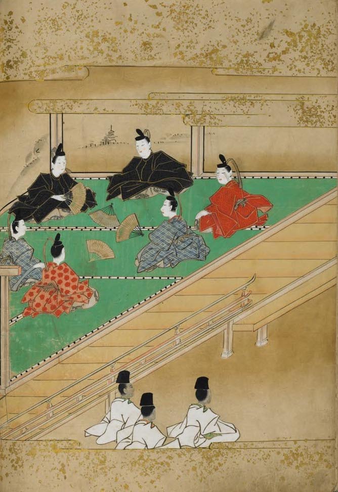 소량은 연심을 누구에게도 말하지 못하고 고뇌했다. 소량이 다다스노 숲에 참배할 때 동행했던 숙부이자 가인인 니조 타메후유는 소량의 마음을 알아채고 미녀의 신원을 조사했다. 그녀는 사이온지 킨아키의 딸로, 중궁 사이온지 키시의 미쿠시게도노를 맡고 있었으나, 이미 토쿠다이지 사다이쇼(토쿠다이지 킨키요로 추정)와 약혼한 상태였다.타메후유는 조카의 사랑을 이루어주기 위해, 미쿠시게도노의 아버지 킨아키에게 부탁하여 그의 저택에서 가회(歌会, 와카 모임)를 열었다. 모두 취기가 돌자 소량은 타메후유의 도움으로 미쿠시게도노의 방에 몰래 들어갔다. 소량이 사랑의 고민을 고백했지만, 미쿠시게도노는 침묵으로 거절했고, 그 밤은 아무 일 없이 지나갔다.