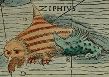 중세 필사본에서 보이는 "Ziphiusla"의 이름은 그리스어 "검": xiphos/ξίφοςel 또는 "황새치": ξιφίας|xiphiasel (검에서 유래)에서 어원을 찾아볼 수 있으며, "몸의 일부가 칼날인" 특징을 가진 바다 괴물로 다양한 모습으로 그려졌다.[60] 콘라트 게스너의 『동물지』는 『북방 민족 문화지』를 인용하여 "부엉이 같은 머리와 검과 같은 등을 가지고, 넓은 입으로 물범을 삼킨다"는 그림을 싣고 있다.[60] 또한 게스너는 고대의 "''Aries'' (''Aries marinus'')"가 비슷한 생물이라고 기록했지만, 퀴비에 형제는 이 "''Aries marinus''"를 "범고래"라고 추정했다[61]。