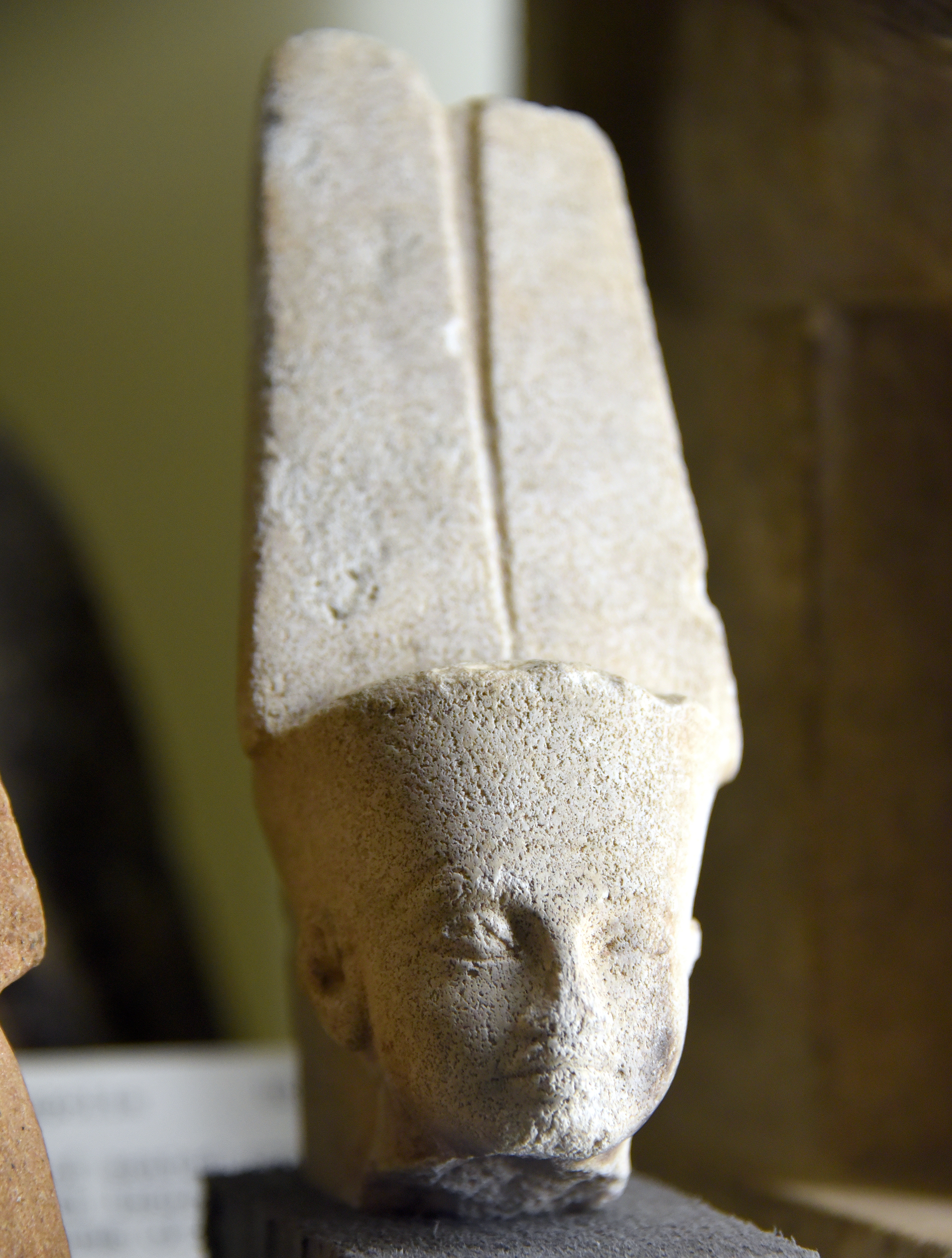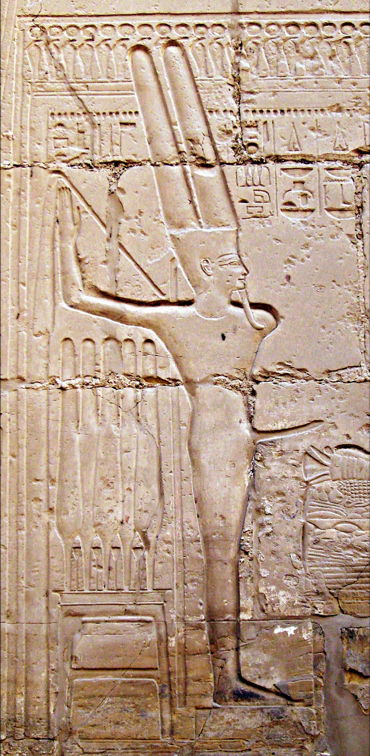 머리에는 깃털 두 개가 달린 왕관을 쓰고 있으며, 이마 주위에는 땅까지 길게 늘어뜨린 붉은 리본을 두르고 있다. 일부 학자들은 이 리본이 성적인 에너지를 나타낸다고 해석한다.
