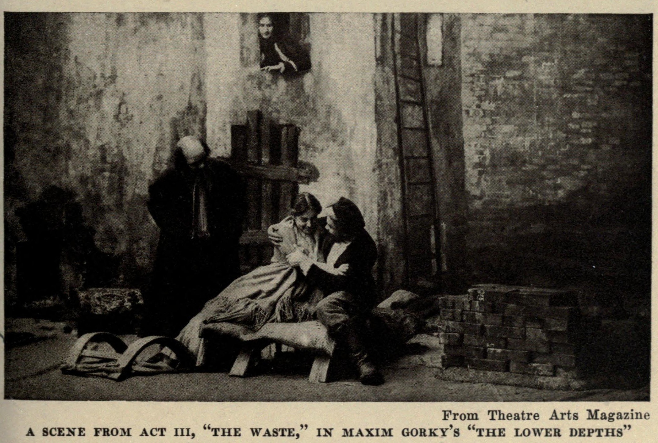막심 고리키의 희곡 '밑바닥에서'는 1902년 모스크바 예술좌를 위해 쓰여졌으며, 단첸코에 의해 초연되었다. 이 작품은 사회에서 소외된 부랑자들의 삶을 통해 그들 안에도 아름다운 인간적 광휘가 있으며, 밝은 미래와 연결될 수 있음을 강조한다. 한국에서는 1933년 11월 보성전문학교(현 고려대학교) 연극부에서 처음 공연되었다.[3]