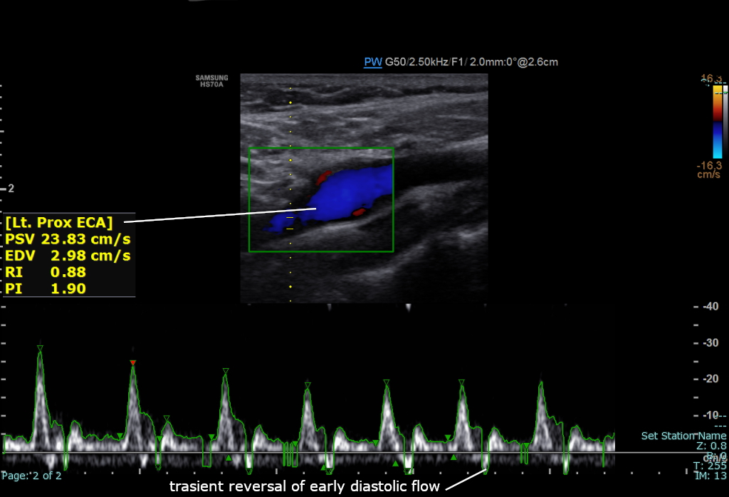 PSV 값이 200cm/s를 초과하면 바깥 목동맥 협착의 50% 이상을 예측하는 것으로 간주된다.[5]