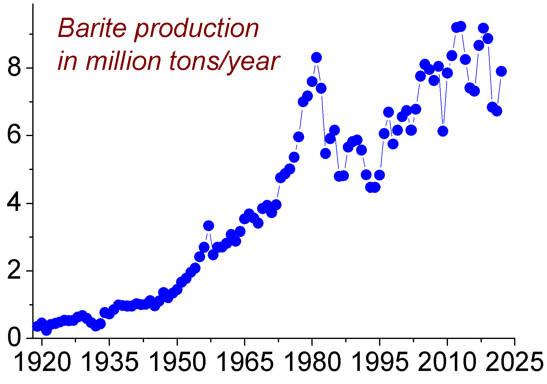 2011년 기준으로, 중국은 전 세계 생산량의 50% 이상을 차지했으며, 그 뒤를 이어 인도(14%), 모로코(8.3%), 미국(8.2%), 이란과 카자흐스탄(각각 2.6%), 터키(2.5%) 순이다.[15]