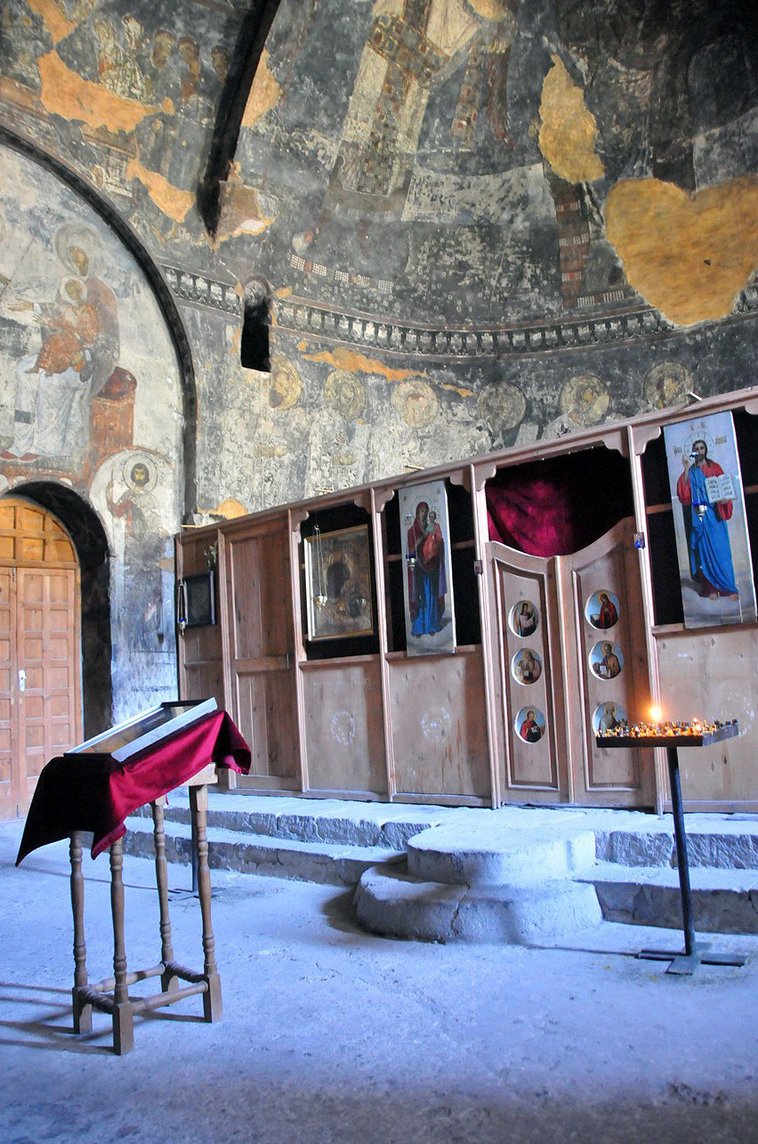 벽화에는 그리스도의 생애 주요 장면들이 묘사되어 있다. 수태고지를 시작으로 예수 탄생, 예수 봉헌, 예수 세례, 예수 변모, 나사로의 부활, 예루살렘 입성, 최후의 만찬, 세족례, 예수 수난, 지옥 강하, 예수 승천, 성령 강림, 돔미션(교회가 때때로 성모 승천 교회로 불리는 이유이며, 이는 돔미션의 정교회 축일과 일치한다) 등이 그려져 있다.[6][9] 더 낮은 부분에는 성인들의 중재를 상징하는 성인들과 스틸라이트의 그림들이 있다. 성소 뒷벽에는 열두 교부가 그려져 있다. 나르텍스에는 최후의 심판, 아브라함의 품, 십자가가 새겨진 메달을 든 천사들, 그리고 성 스테파노의 생애를 다룬 세 장면이 묘사되어 있다. 1283년 지진으로 인해 일부 벽화는 소실되었다.[6] 이 벽화들은 프레스코 기법이 아닌 ''세코'' 기법으로 제작되었으며, "기독교 동방 세계와 비잔틴 미술 세계와의 접촉을 증명하지만, 지역 예술 전통을 사용하여 적용되었다".[8] 벽화는 제단 부분에 이름이 적힌 조르지(Georgi)라는 화가가 그린 것이다.[7]