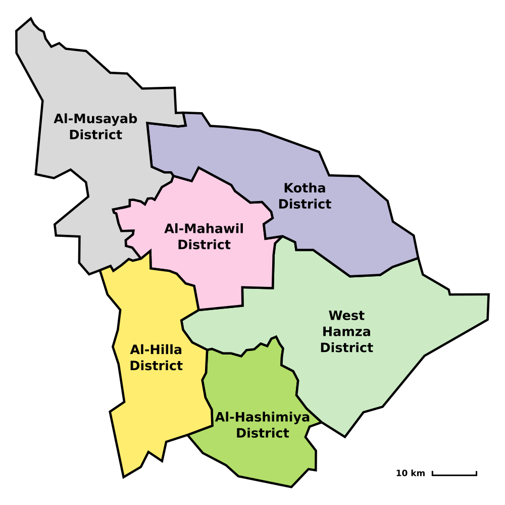 인접한 주는 북쪽으로 바그다드 주, 북동쪽으로 디얄라 주, 동쪽으로 와시트 주, 남동쪽으로 카디시야 주, 남서쪽으로 나자프 주, 서남서쪽으로 카르발라 주, 서쪽으로 안바르 주 등 7개 주이다.