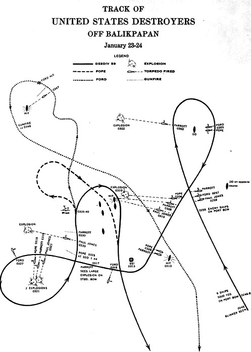1942년 1월 23일 밤부터 1월 24일 새벽까지 보르네오 섬의 유전지대 발릭파판을 점령하려는 일본군 수송선단과 이를 호위하는 제4수뢰전대(사령관 니시무라 쇼지 소장)를 연합군 구축함과 잠수함이 습격하면서 발릭파판 해전이 벌어졌다.[74][75][76]