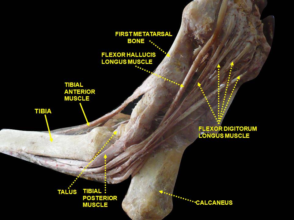 발꿈치뼈를 발바닥 쪽에서 보면 높낮이가 있다. 엄지발가락 쪽의 경골 내과 아래의 하재거돌기, 거골, 종골이 높고, 그 사이, 즉 발꿈치의 중앙 부분이 낮아 전체적으로 홈과 같다. 이 홈을 덮는 듯이 인대가 팽팽하게 당겨져 있다. 이 인대를 '''굴근지대'''라고 부르며, 굴근지대와 발꿈치뼈로 형성된 터널을 '''족근관'''이라고 부른다.