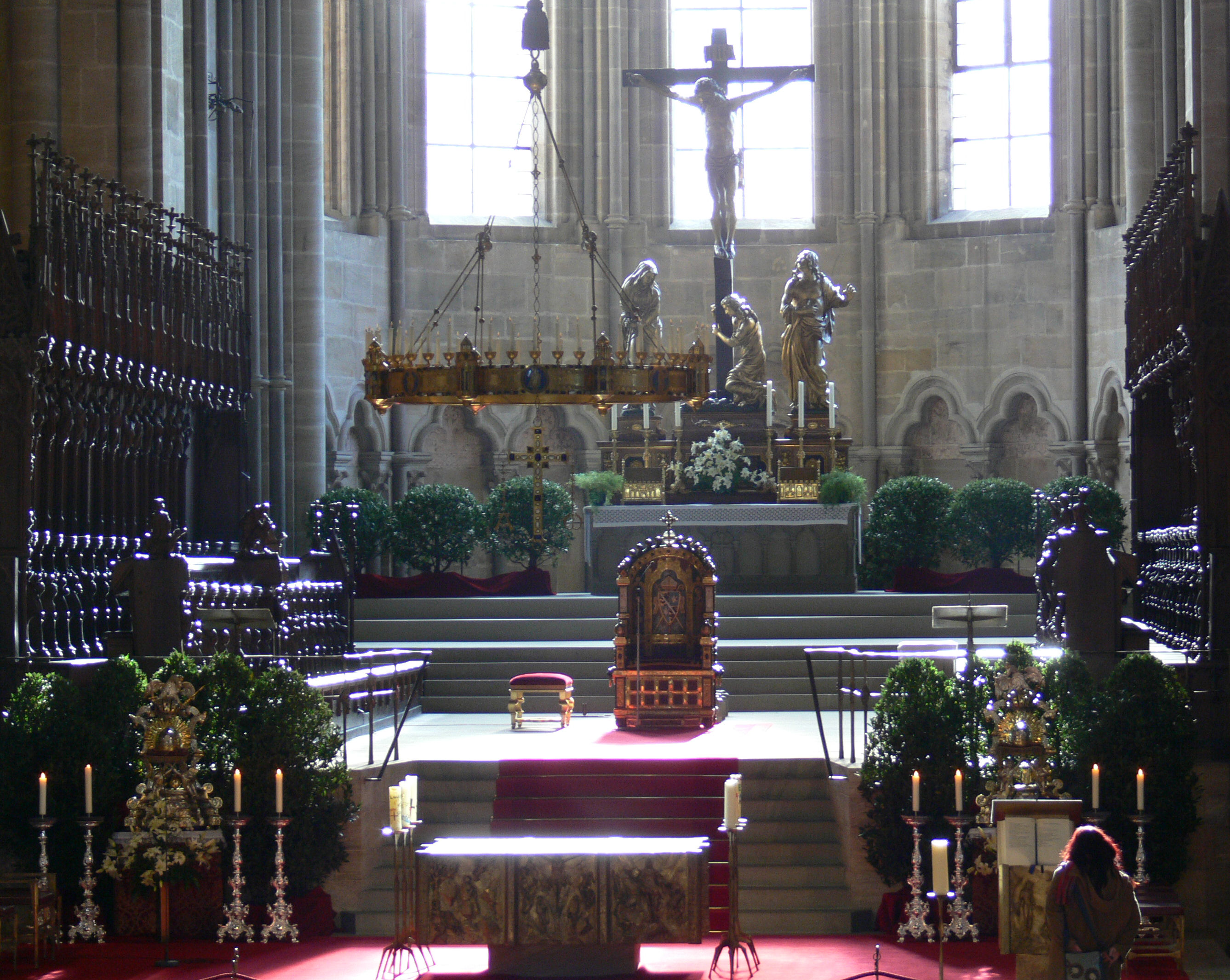 동쪽 합창단은 아래에 암실(Krypta)이 있기 때문에 바닥이 높게 올라가 있으며, 성 조지에게 봉헌되었다. 이는 신성 로마 제국을 상징한다. 남쪽 합창단 칸막이를 장식하는 인물들 중, 처음 세 쌍의 사도상은 "자비의 문"(''Gnadenpforte'')을 만든 석공들의 작품으로 추정된다. 다른 인물들과 북쪽 칸막이에 있는 열두 명의 예언자상은 후대의 양식을 보여준다. 조각된 키메라와 사자들이 있는 합창석은 14세기에 만들어졌다.[1] 앱스의 프레스코화는 비교적 최근인 1927년에서 1928년 사이에 제작되었다.[3]