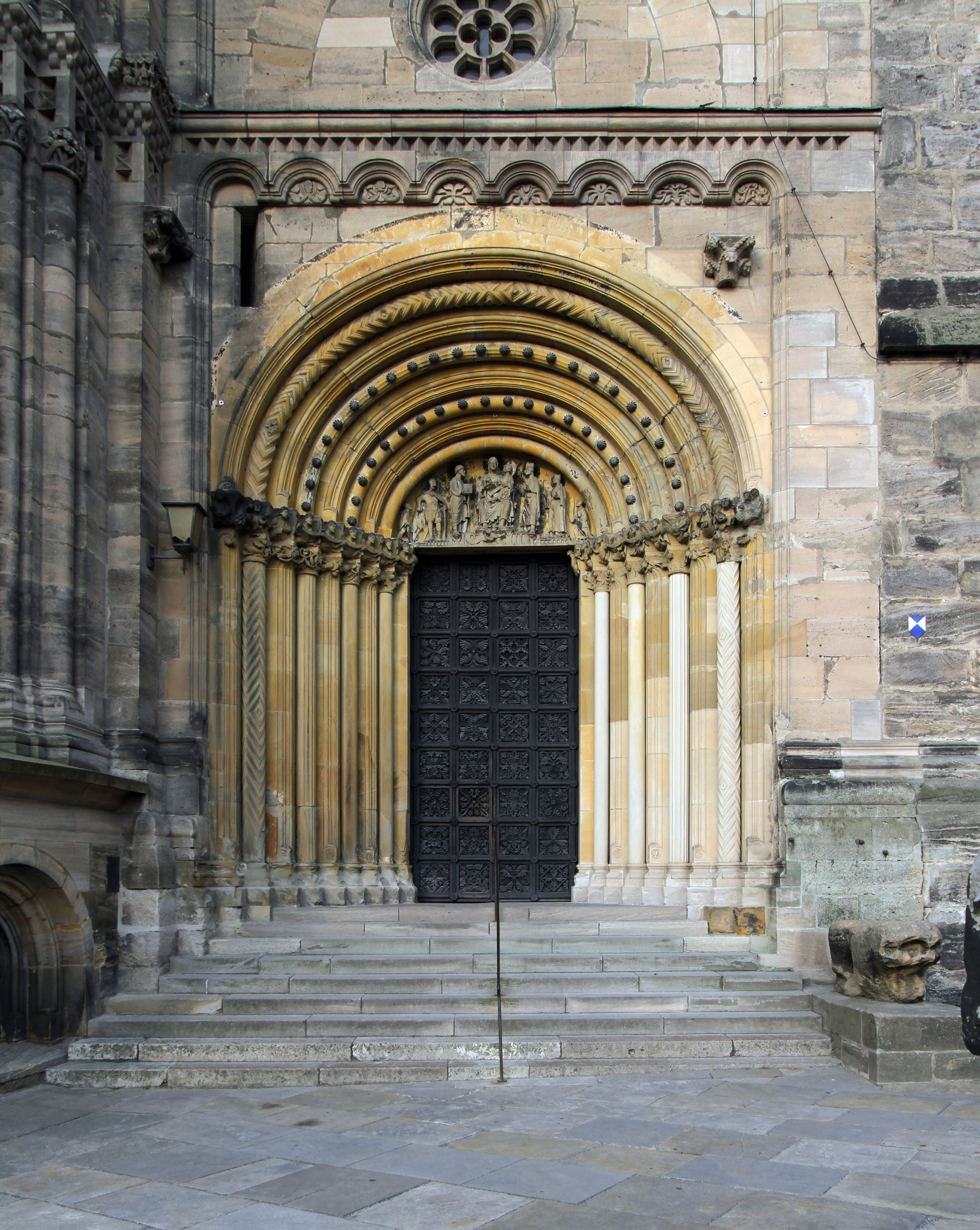 대성당의 이중 합창단 구조 때문에 서쪽이 아닌 북쪽 벽 중앙에 위치한 주요 문은 제후 문(de)이라고 불리며, 축일(聖日)에만 열린다. 이 문은 북쪽 측면 통로로 연결되며, 후기 로마네스크 시대 장인들(예언자와 사도)이 만들기 시작했지만 초기 고딕 시대 장인들이 완성했다(최후의 심판이 타이머넘에 있다). 기둥 위에 있는 조각상(복제품)은 교회와 회당이다(원본은 1937년에 옮겨졌다). 또한 최후의 심판을 알리는 아브라함과 천사의 조각상도 있다.[1][3]