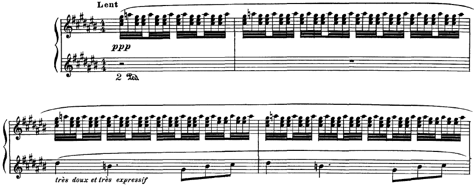 변호단조, Tres lentit(매우 느리게), 4/4박자이다. 변바음의 옥타브가 처음부터 끝까지 장송의 종처럼 으스스하게 울려 퍼진다. 매우 느리고 장중한 템포는 변하지 않지만, 박자는 계속 변화한다. 이러한 요소들은 암담하고 막막한 분위기를 조성한다.